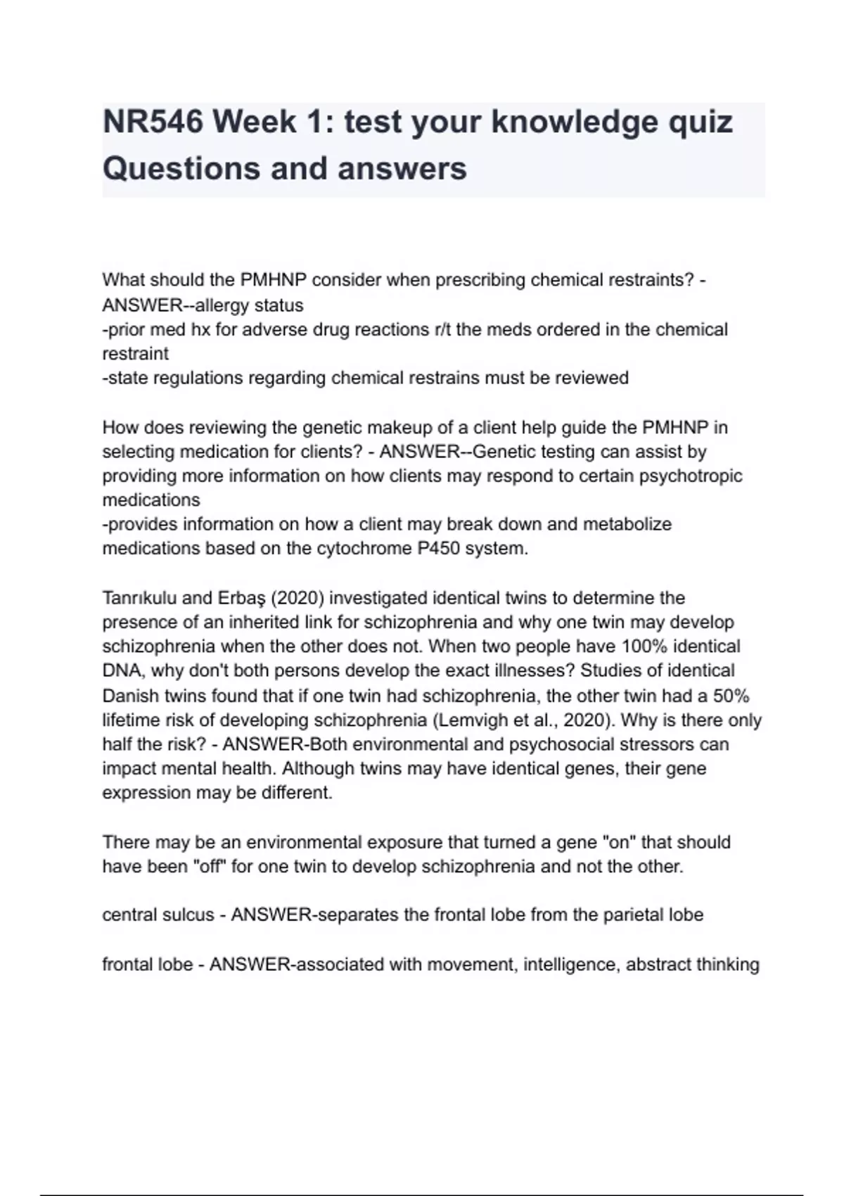 What should the PMHNP consider when prescribing chemical restraints? - ANSWER--allergy status -prior med hx for adverse drug reactions r/t the meds ordered in the chemical restraint -state regulations regarding chemical restrains must be reviewed How does reviewing the genetic makeup of a client help guide the PMHNP in selecting medication for clients? - ANSWER--Genetic testing can assist by providing more information on how clients may respond to certain psychotropic medications -provides information on how a client may break down and metabolize medications based on the cytochrome P450 system. Tanrıkulu and Erbaş (2020) investigated identical twins to determine the presence of an inherited link for schizophrenia and why one twin may develop schizophrenia when the other does not. When two people have 100% identical DNA, why don't both persons develop the exact illnesses? Studies of identical Danish twins found that if one twin had schizophrenia, the other twin had a 50% lifetime risk of developing schizophrenia (Lemvigh et al., 2020). Why is there only half the risk? - A