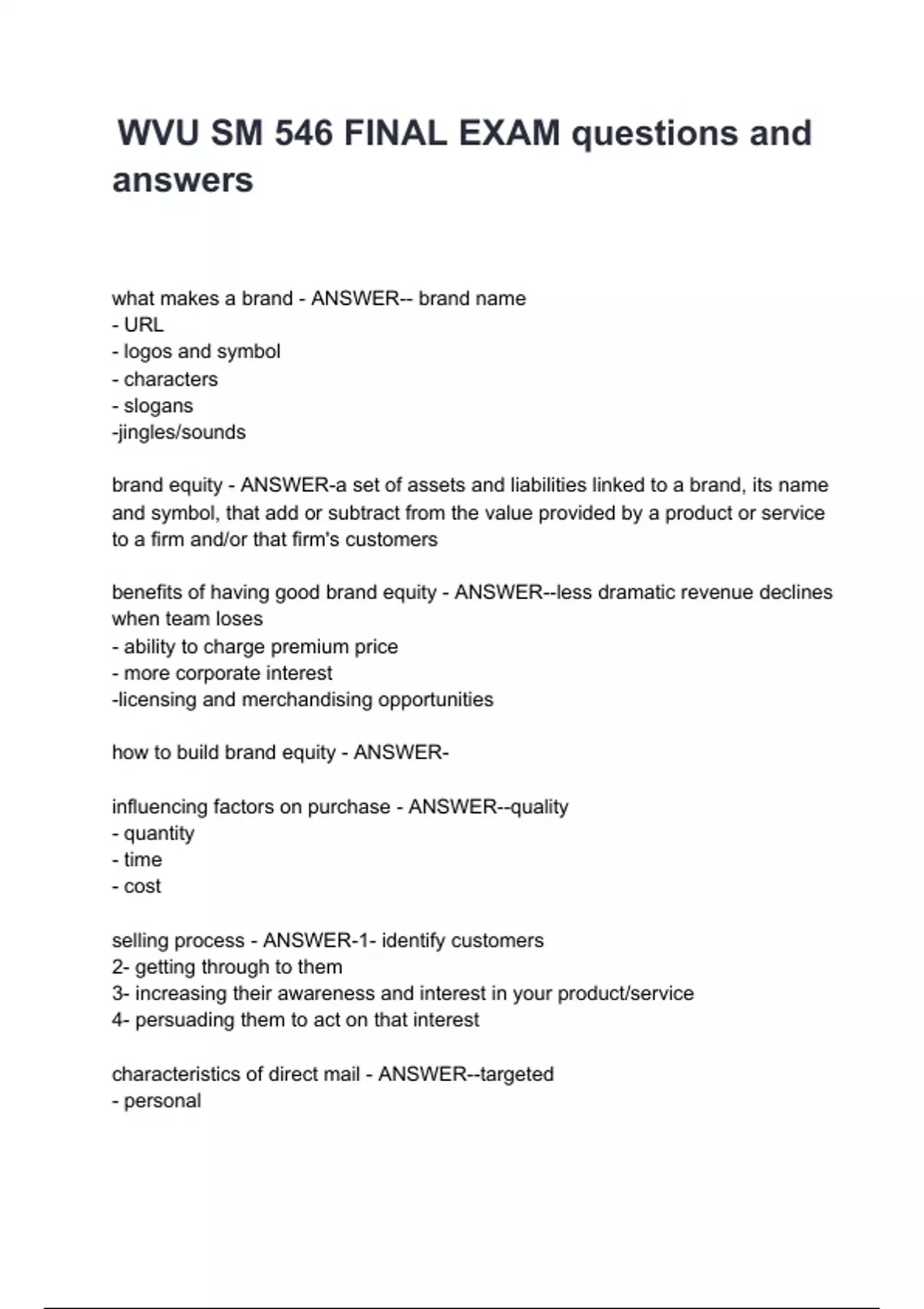 WVU SM 546 FINAL EXAM questions and answers what makes a brand - ANSWER-- brand name - URL - logos and symbol - characters - slogans -jingles/sounds brand equity - ANSWER-a set of assets and liabilities linked to a brand, its name and symbol, that add or subtract from the value provided by a product or service to a firm and/or that firm's customers benefits of having good brand equity - ANSWER--less dramatic revenue declines when team loses - ability to charge premium price - more corporate interest -licensing and merchandising opportunities how to build brand equity - ANSWERinfluencing factors