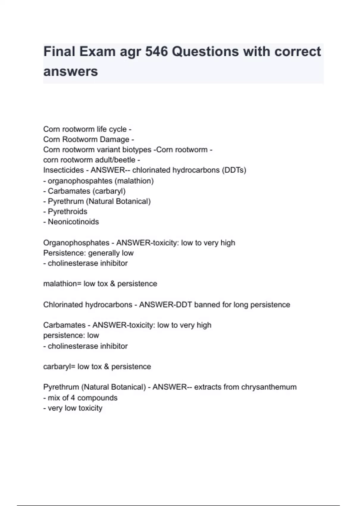 Corn rootworm life cycle - Corn Rootworm Damage - Corn rootworm variant biotypes -Corn rootworm - corn rootworm adult/beetle - Insecticides - ANSWER-- chlorinated hydrocarbons (DDTs) - organophospahtes (malathion) - Carbamates (carbaryl) - Pyrethrum (Natural Botanical) - Pyrethroids - Neonicotinoids Organophosphates - ANSWER-toxicity: low to very high Persistence: generally low - cholinesterase inhibitor malathion= low tox & persistence Chlorinated hydrocarbons - ANSWER-DDT banned for long persistence Carbamates - ANSWER-toxicity: low to very high persistence: low - cholinesterase inhibitor carbaryl= low tox & persistence Pyrethrum (Natural Botanical) - ANSWER-- extracts from chrysanthemum - mix of 4 compound