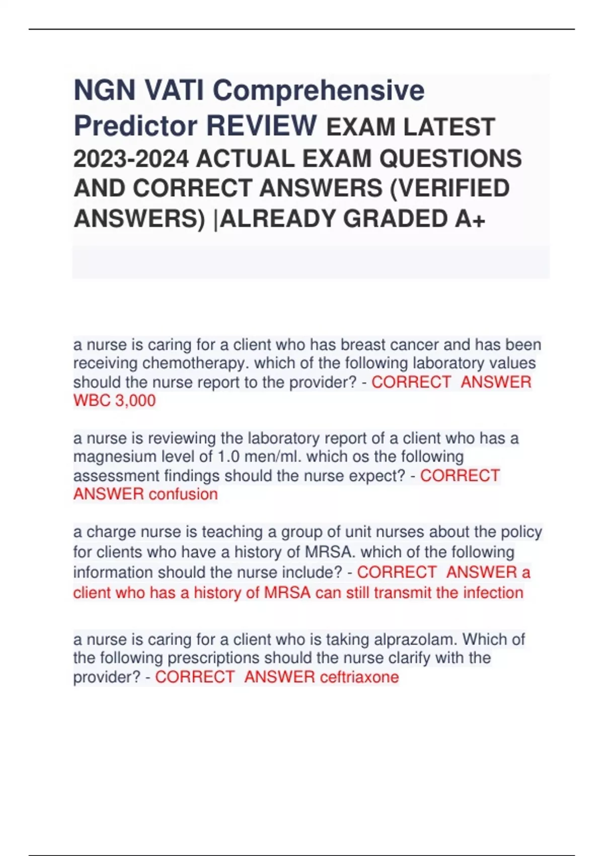 NGN VATI Comprehensive Predictor REVIEW EXAM LATEST ACTUAL EXAM QUESTIONS AND CORRECT ANSWERS (VERIFIED ANSWERS) |ALREADY GRADED A+ a nurse is caring for a client who has breast cancer and has been receiving chemotherapy. which of the following laboratory values should the nurse report to the provider? - CORRECT ANSWER WBC 3,000 a nurse is reviewing the laboratory report of a client who has a magnesium level of 1.0 men/ml. which os the following assessment findings should the nurse expect? - CORRECT ANSWER confusion a charge nurse is teaching a group of unit nurses about the policy for clients who have a history of MRSA. which of the following information should the nurse include? - CORRECT ANSWER a client who has a history of MRSA can still transmit the infection a nurse is caring for a client who is taking alprazolam. Which of the following prescriptions should the nurse clarify with the provider? - CORRECT ANSWER ceftriaxone a nurse is assessing a client who is postoperative following abdominal surgery. The client states "I feel like my incision ripped open" the nurse notes dehiscence of the incision. which of the following actions should the nurse take? - CORRECT ANSWER place the client in a low-fowlers position a nurse is caring for a client who is receiving radiation therapy through a sealed implant. Which of the following actions should the nurse take? - CORRECT ANSWER wear a lead apron when providing care for the client. a nurse is inserting an IV catheter for a client who requires fluid replacement. Which of the following actions should the nurse take? - CORRECT ANSWER apply the tourniquet 15 cm above the insertion site a nurse is caring for a client who reports difficulty falling asleep at night. which of the following actions should the nurse take? - CORRECT ANSWER schedule routine care tasks during the hours when the client is awake a nurse is providing discharge teaching to a client who is postpartum and plans to breastfeed. which of the following should the nurse recommend the client increases in their diet during lactation? - CORRECT ANSWER calcium a nurse is providing nutritional counseling to the parents of a toddler. which of the following instructions should the nurse include in the teaching? - CORRECT ANSWER offer snacks throughout the day a nurse is assessing a clients cardiovascular system. identify where the nurse should place the diaphragm of the stethoscope to best hear the closing of the aortic valve. - CORRECT ANSWER option A