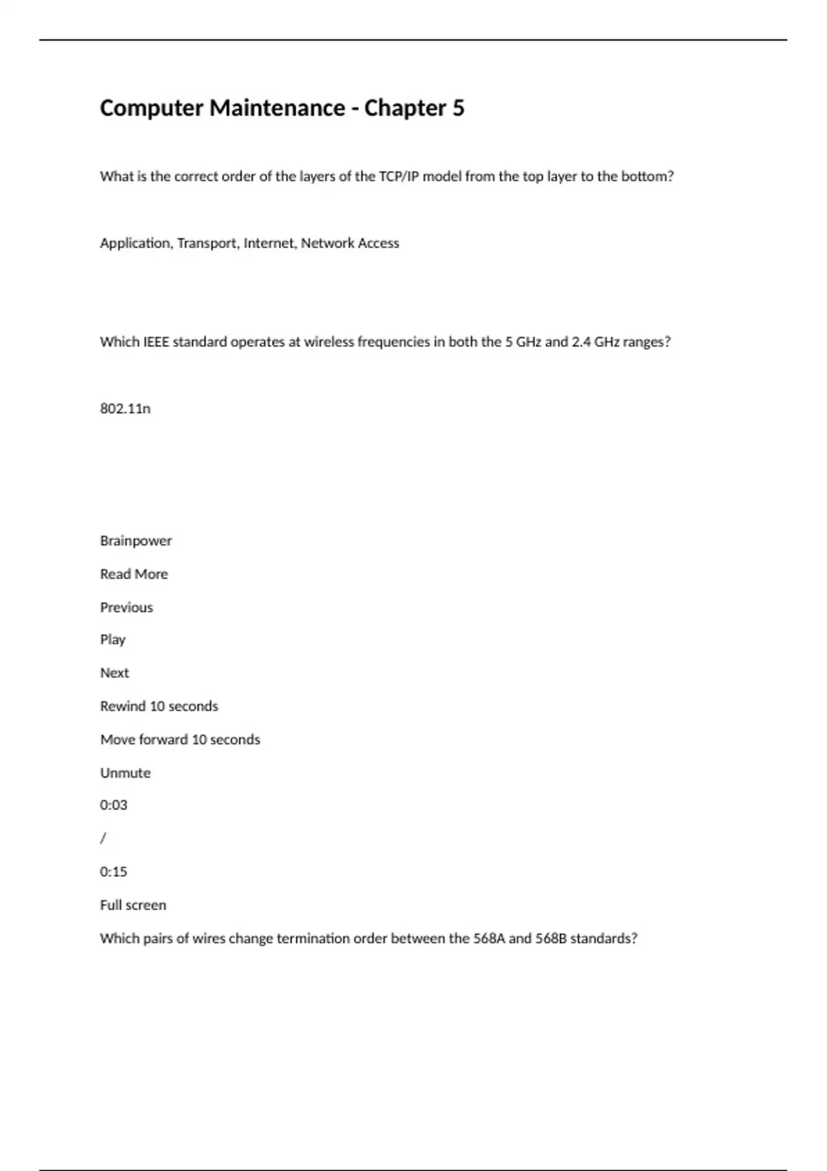 What is the correct order of the layers of the TCP/IP model from the top layer to the bottom? Application, Transport, Internet, Network Access Which IEEE standard operates at wireless frequencies in both the 5 GHz and 2.4 GHz ranges? 802.11n Brainpower Read More Previous Play Next Rewind 10 seconds Move forward 10 seconds Unmute 0:03 / 0:15