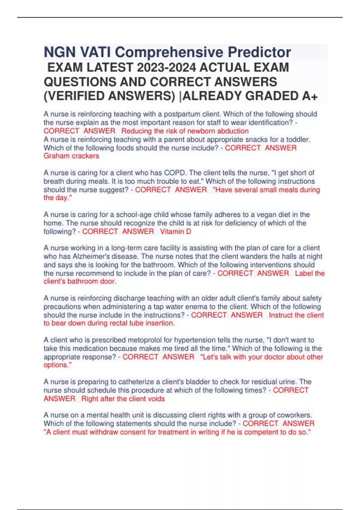 NGN VATI Comprehensive Predictor EXAM LATEST ACTUAL EXAM QUESTIONS AND CORRECT ANSWERS (VERIFIED ANSWERS) |ALREADY GRADED A+ A nurse is reinforcing teaching with a postpartum client. Which of the following should the nurse explain as the most important reason for staff to wear identification? - CORRECT ANSWER Reducing the risk of newborn abduction A nurse is reinforcing teaching with a parent about appropriate snacks for a toddler. Which of the following foods should the nurse include? - CORRECT ANSWER Graham crackers A nurse is caring for a client who has COPD. The client tells the nurse, "I get short of breath during meals. It is too much trouble to eat." Which of the following instructions should the nurse suggest? - CORRECT ANSWER "Have several small meals during the day." A nurse is caring for a school-age child whose family adheres to a vegan diet in the home. The nurse should recognize the child is at risk for deficiency of which of the following? - CORRECT ANSWER Vitamin D A nurse working in a long-term care facility is assisting with the plan of care for a client who has Alzheimer's disease. The nurse notes that the client wanders the halls at night and says she is looking for the bathroom. Which of the following interventions should the nurse recommend to include in the plan of care? - CORRECT ANSWER Label the client's bathroom door. A nurse is reinforcing discharge teaching with an older adult client's family about safety precautions when administering a tap water enema to the client. Which of the following should the nurse include in the instructions? - CORRECT ANSWER Instruct the client to bear down during rectal tube insertion. A client who is prescribed metoprolol for hypertension tells the nurse, "I don't want to take this medication because makes me tired all the time." Which of the following is the appropriate response? - CORRECT ANSWER "Let's talk with your doctor about other options." A nurse is preparing to catheterize a client's bladder to check for residual urine. The nurse should schedule this procedure at which of the following times? - CORRECT ANSWER Right after the client voids A nurse on a mental health unit is discussing client rights with a group of coworkers. Which of the following statements should the nurse include? - CORRECT ANSWER "A client must withdraw consent for treatment in writing if he is competent to do so." A nurse is collecting data from a client who has diabetes mellitus. Which of the following findings indicates the client might be experiencing diabetic ketoacidosis? - CORRECT ANSWER Anuria A nurse is reinforcing teaching with the parent of a toddler who has difficulty falling asleep. Which of the following instructions should the nurse include? - CORRECT ANSWER Establish a bedtime routine. A nurse is caring for a client who is receiving warfarin 5 mg PO daily. Which of the following laboratory values should the nurse check prior to administering the medication? (Select all that apply.) - CORRECT ANSWER PT Serum potassium INR Serum sodium BUN A nurse is collecting a sputum speciemen from a client for culture and . senstivity. Which of the following actions should the nurse take - CORRECT ANSWER swab the oraphanyx with a sertile swab A nurse is reniforcing teaching with a school age child who has hemophilla about particpiting in school sports. Which of the following sports should the nurse recommend for the child - CORRECT ANSWER golf, swimming, walking, cycling, frisbee, tee-ball, hiking, weight lifting A nurse is disscussing infromed consent with a cleint prior their surgical procedure. Which of the following nurses role is obtaining informed consent - CORRECT ANSWER ensure the client gives voluntarily consent for surgery A nurse is admitting a client who scheduled for elective surgery. Which of the following actions should the nurse take to verifty the status of the client advance directives - CORRECT ANSWER check for the written dnr in the medical record A nurse is collecting a sputum speciem from a client for culture and sensitvity, Which of the following should the nurse take - CORRECT ANSWER instruct the client to rinse with an aseptic mouthwash proir to specimen collection A nurse is caring for a client who has a new colostomy bag, the client tells the nurse " I dont want anyone to see me with this bag, Which of the following response should the nurse make - CORRECT ANSWER most people who have them live full lives A nurse is reinforcing teaching about a safety plan for a client who report partner violence. which of the instruction should the nurse include - CORRECT ANSWER reherase your escape route A nurse is collecting data from a client who has a long leg cast on left leg and reports servere pain. Which of the following findings should the nurse idenitfy as indication that