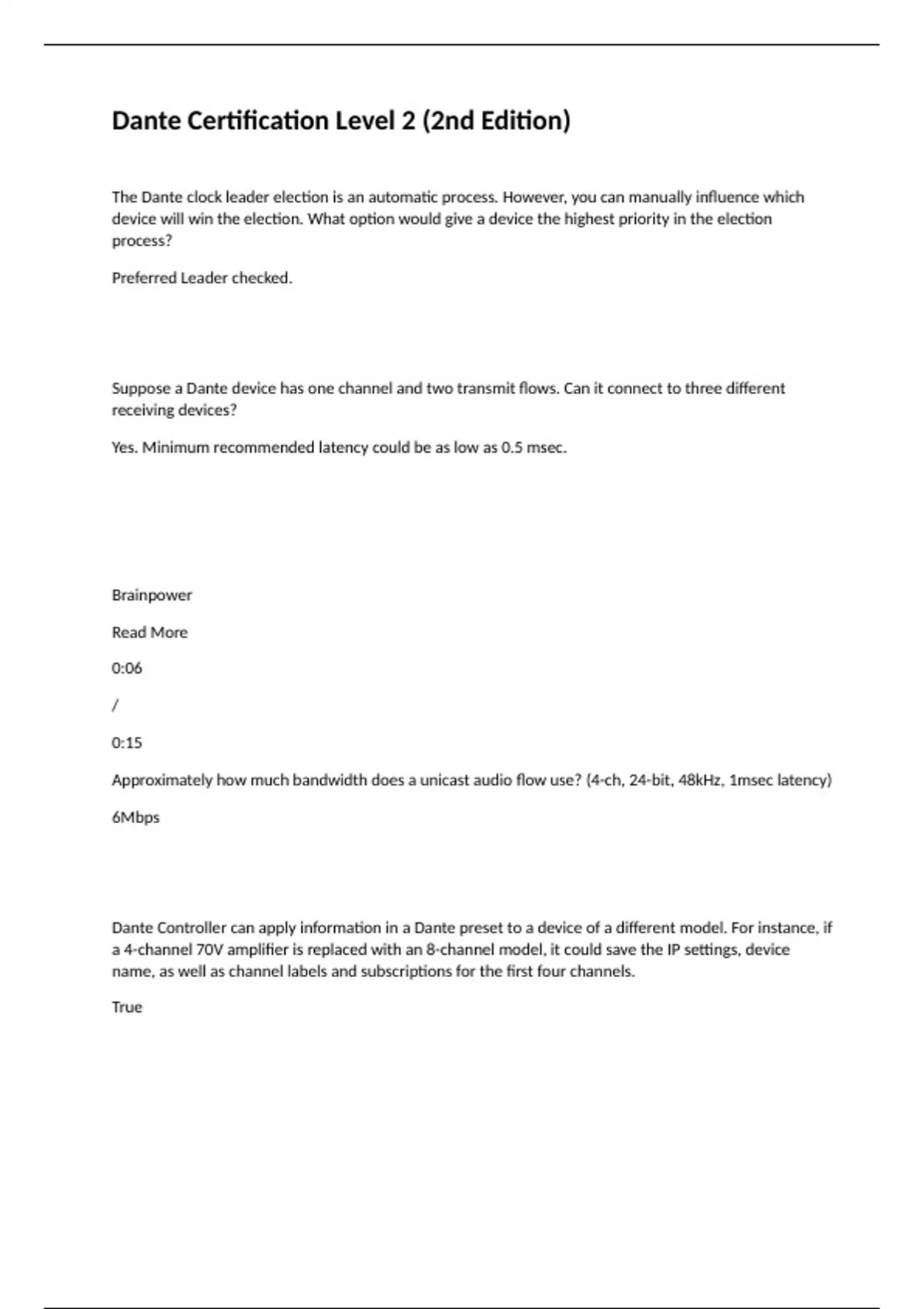The Dante clock leader election is an automatic process. However, you can manually influence which device will win the election. What option would give a device the highest priority in the election process? Preferred Leader checked. Suppose a Dante device has one channel and two transmit flows. Can it connect to three different receiving devices? Yes. Minimum recommended latency could be as low as 0.5 msec. Brainpower Read More 0:06 / 0:15 Approximately how much bandwidth does a unicast audio flow use? (4-ch, 24-bit, 48kHz, 1msec latency) 6Mbps