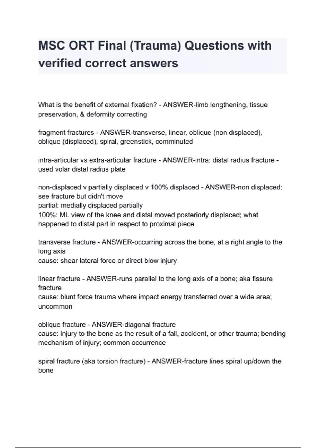 What is the benefit of external fixation? - ANSWER-limb lengthening, tissue preservation, & deformity correcting fragment fractures - ANSWER-transverse, linear, oblique (non displaced), oblique (displaced), spiral, greenstick, comminuted intra-articular vs extra-articular fracture - ANSWER-intra: distal radius fracture - used volar distal radius plate non-displaced v partially displaced v 100% displaced - ANSWER-non displaced: see fracture but didn't move partial: medially displaced partially 100%: ML view of the knee and distal moved posteriorly displaced; what happened to distal part in respect to proximal piece transverse fracture - ANSWER-occurring across the bone, at a right angle to the long axis cause: shear lateral force or direct blow injury linear fracture - ANSWER-runs parallel to the long axis of a bone; aka fissure fracture cause: blunt force trauma where impact energy transferred over a wide area; uncommon oblique fracture - ANSWER-diagonal fracture cause: injury to the bone as the result of a fall, accident, or other trauma; bending mechanism of