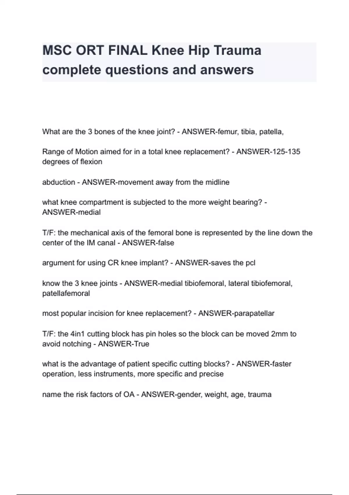What are the 3 bones of the knee joint? - ANSWER-femur, tibia, patella, Range of Motion aimed for in a total knee replacement? - ANSWER-125-135 degrees of flexion abduction - ANSWER-movement away from the midline what knee compartment is subjected to the more weight bearing? - ANSWER-medial T/F: the mechanical axis of the femoral bone is represented by the line down the center of the IM canal - ANSWER-false argument for using CR knee implant? - ANSWER-saves the pcl know the 3 knee joints - ANSWER-medial tibiofemoral, lateral tibiofemoral, patellafemoral most popular incision for knee replacement? - ANSWER-parapatellar T/F: the 4in1 cutting block has pin holes so the block can be moved 2mm to avoid notching - ANSWER-True what is the advantage of patient specific cutting blocks? - ANSWER-faster operation, l