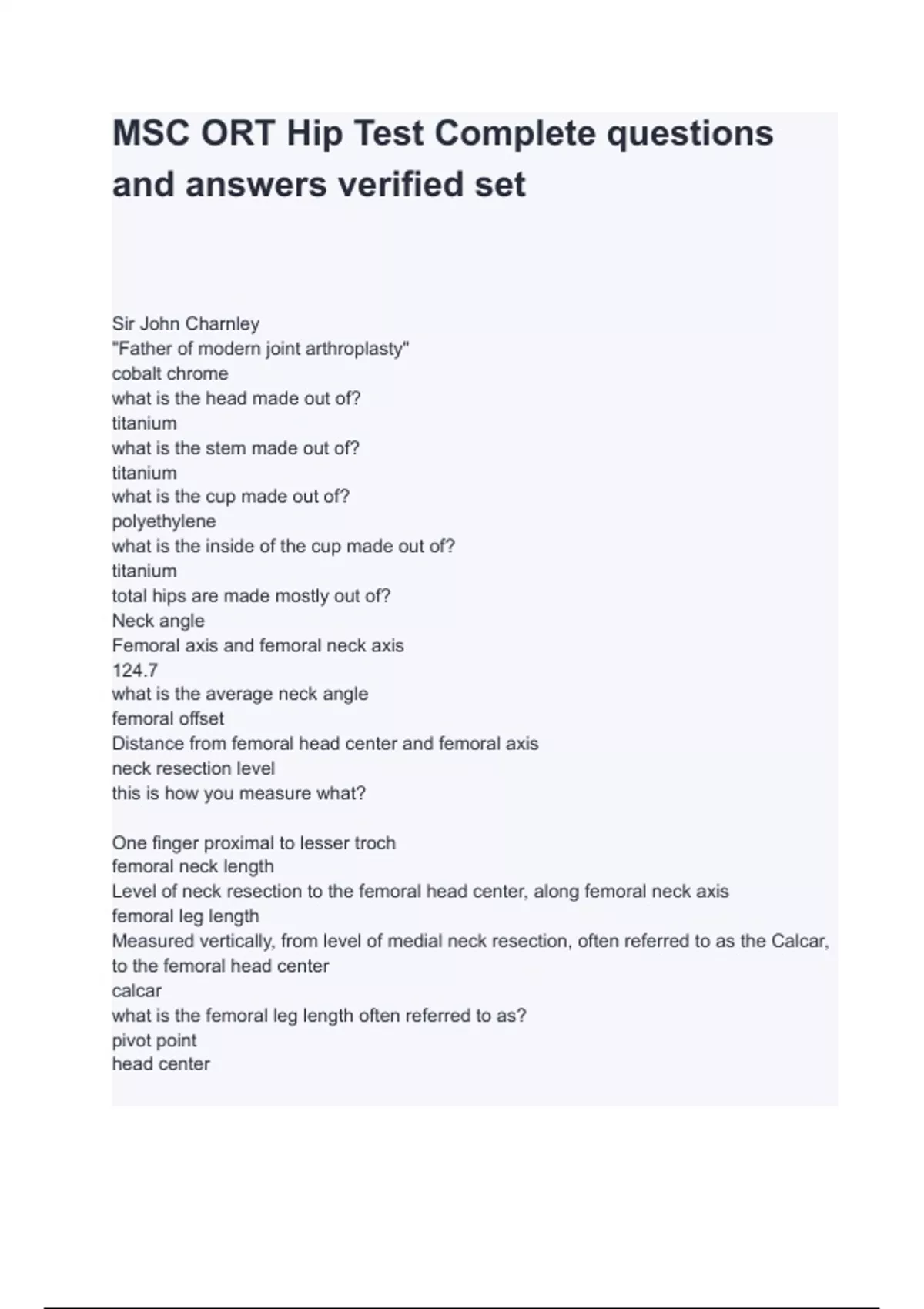 Sir John Charnley "Father of modern joint arthroplasty" cobalt chrome what is the head made out of? titanium what is the stem made out of? titanium what is the cup made out of? polyethylene what is the inside of the cup made out of? titanium total hips are made mostly out of? Neck angle Femoral axis and femoral neck axis 124.7 what is the average neck angle femoral offset Distance from femoral head center and femoral axis neck resection level this is how you measure what? One finger proximal to lesser troch femoral neck length Level of neck resection to the femoral head center, along femoral neck axis femoral leg len