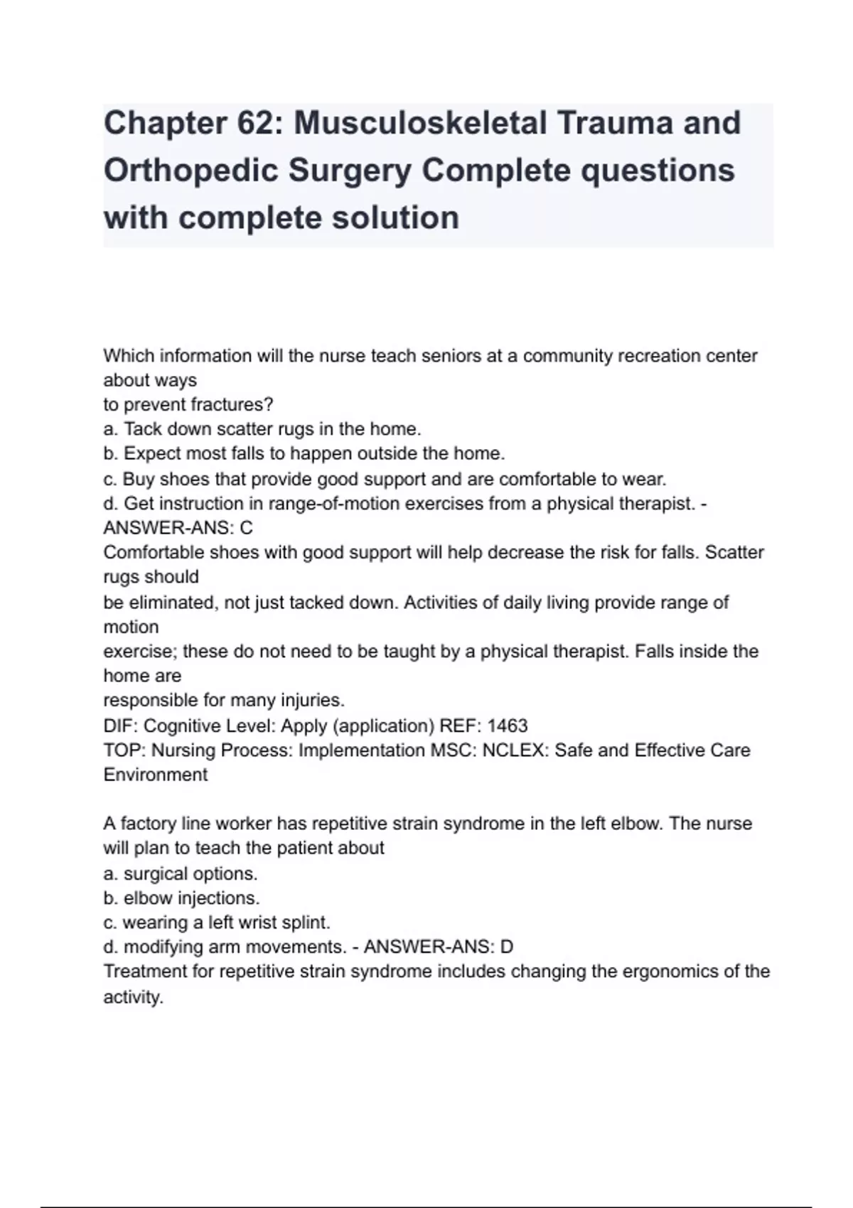 Chapter 62: Musculoskeletal Trauma and Orthopedic Surgery Complete questions with complete solution Which information will the nurse teach seniors at a community recreation center about ways to prevent fractures? a. Tack down scatter rugs in the home. b. Expect most falls to happen outside the home. c. Buy shoes that provide good support and are comfortable to wear. d. Get instruction in range-of-motion exercises from a physical therapist. - ANSWER-ANS: C Comfortable shoes with good support will help decrease the risk for falls. Scatter rugs should be eliminated, not just tacked down. Activities of daily living provide range of motion exercise; these do not need to be taught by a physical therapist. Falls inside the home are responsible for many injuries. DIF: Cognitive Level: Apply (application) REF: 1463 TOP: Nursing Process: Implementation MSC: NCLEX: Safe and Effective Care Environment A factory line worker has repetitive strain syndrome in the left elbow. The nurse will plan to teach the patient about a. surgical options. b. elbow injections. c. wearing a left