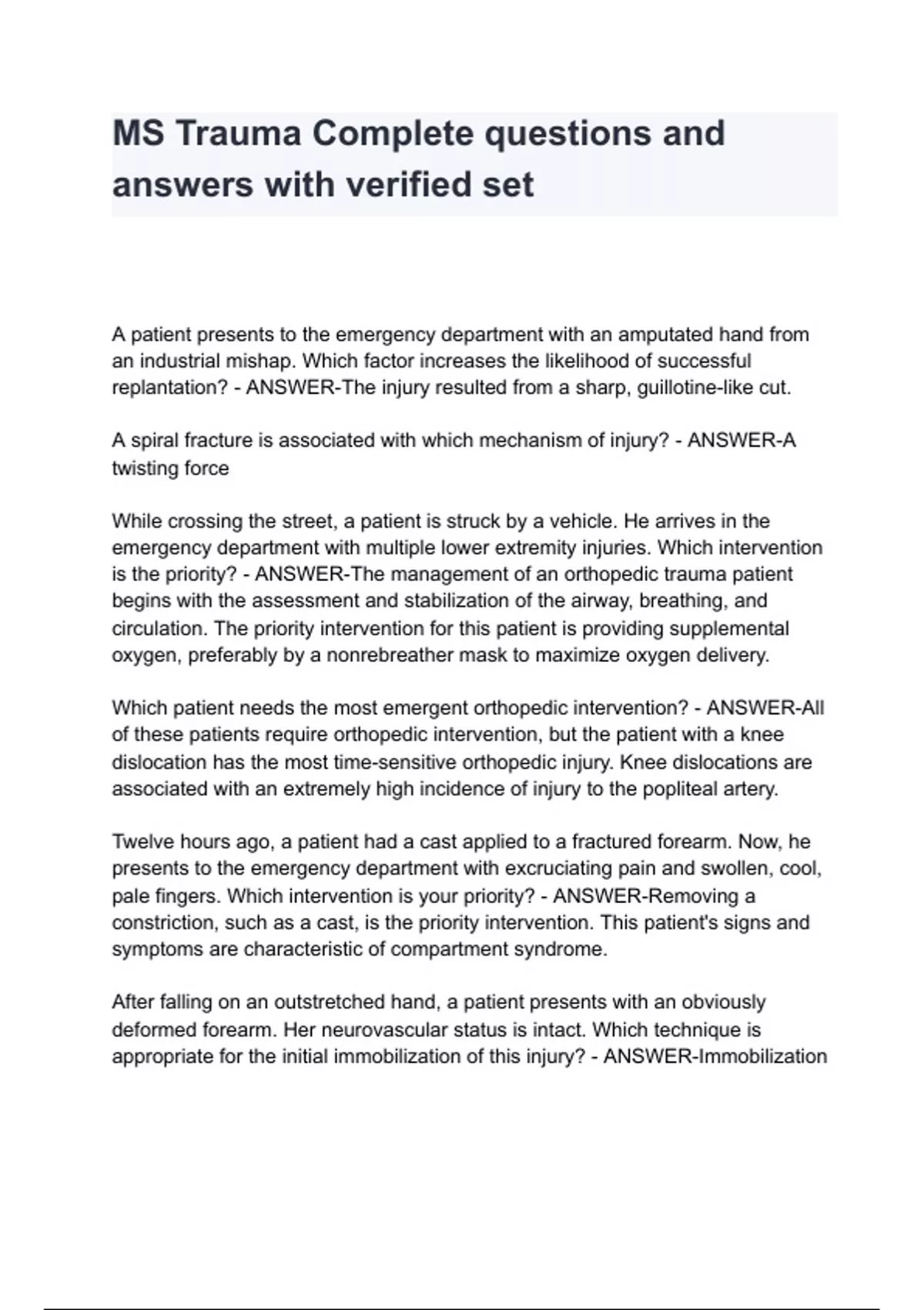 MS Trauma Complete questions and answers with verified set A patient presents to the emergency department with an amputated hand from an industrial mishap. Which factor increases the likelihood of successful replantation? - ANSWER-The injury resulted from a sharp, guillotine-like cut. A spiral fracture is associated with which mechanism of injury? - ANSWER-A twisting force While crossing the street, a patient is struck by a vehicle. He arrives in the emergency department with multiple lower extremity injuries. Which intervention is the priority? - ANSWER-The management of an orthopedic trauma patient begins with the assessment and stabilization of the airway, breathing, and circulation. The priority intervention for this patient is providing supplemental oxygen, preferably by a nonrebreather mask to maximize oxygen delivery. Which patient needs the most emergent orthopedic intervention? - ANSWER-All of these patients require orthopedic intervention, but the patient with a knee dislocation has the most time-sensitive orthopedic injury. Knee dislocations are associated with an extremely high incidence of injury to the popliteal artery. Twelve hours ago, a patient had a cast applied to a fractured forearm. Now, he presents to the emergency department with excruciating pain and swollen, cool, pale fingers. Which intervention is your priority? - ANSWER-Removing a constriction, such as a cast, is the priority intervention. This patient's signs and symptoms ar
