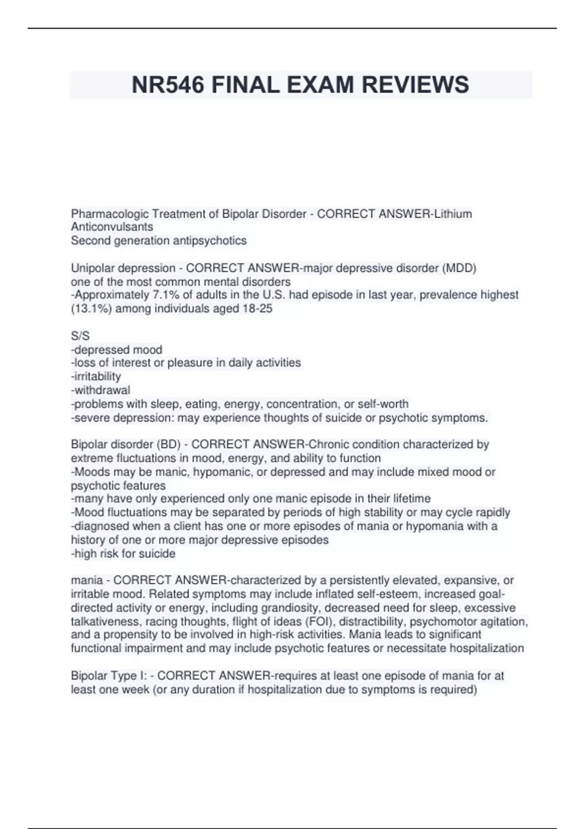 NR546 FINAL EXAM REVIEWS Pharmacologic Treatment of Bipolar Disorder - CORRECT ANSWER-Lithium Anticonvulsants Second generation antipsychotics Unipolar depression - CORRECT ANSWER-major depressive disorder (MDD) one of the most common mental disorders -Approximately 7.1% of adults in the U.S. had episode in last year, prevalence highest (13.1%) among individuals aged 18-25 S/S -depressed mood -loss of interest or pleasure in daily activities -irritability -withdrawal -problems with sleep, eating, energy, concentration, or self-worth -severe depression: may experience thoughts of suicide or psychotic symptoms. Bipolar disorder (BD) - CORRECT ANSWER-Chronic condition characterized by extreme fluctuations in mood, energy, and ability to function -Moods may be manic, hypomanic, or depressed and may include mixed mood or psychotic features -many have only experienced only one manic episode in their lifetime -Mood fluctuations may be separated by periods of high stability or may cycle rapidly -diagnosed when a client has one or more episodes of mania or hypomania with a history of one or more major depressive episodes -high risk for suicide mania - CORRECT ANSWER-characterized by a persistently elevated, expansive, or irritable mood. Related symptoms may include inflated self-esteem, increased goaldirected activity or energy, including grandiosity, decreased need for sleep, excessive talkativeness, racing thoughts, flight of ideas (FOI), distractibility, psychomotor agitation, and a propensity to be involved in high-risk activities. Mania leads to significant functional impairment and may include psychotic features or necessitate hospitalization Bipolar Type I: - CORRECT ANSWER-requires at least one episode of mania for at least one week (or any duration if hospitalization due to symptoms is required) Bipolar Type II: - CORRECT ANSWER-diagnosis requires a current or past hypomanic episode and a current or past major depressive episode. Symptoms last for at least 4 days but fewer than seven. -Hypomanic symptoms are not of sufficient duration or severity to cause significant functional impairment, psychosis, or hospitalization. -Anger and irritability are common. -Clients often enjoy the elevation of mood and are reluctant to report these symptoms, making bipolar more difficult to diagnose if the client presents in the depression phase. Cyclothymia: - CORRECT ANSWER-involves the chronic presentation of hypomanic and depressive symptoms that do not meet the diagnostic criteria for a major depressive or manic/hypomanic episode. If bipolar depression is mistaken for MDD: - CORRECT ANSWER-antidepressant therapy may precipitate a manic episode or induce rapid-cycling bipolar depression -may contribute to the increased incidence of death by suicide in children and adults younger than 25 Antidepressants are used cautiously in clients with bipolar disorder and never as ________________. - CORRECT ANSWER-monotherapy -Antidepressants should be combined with a mood stabilizer to prevent the onset of a hypomanic or manic episode DA, NE Dysfunction causes what mood related symptoms - CORRECT ANSWERDecreased positive affect: depressed mood loss of joy lack of interest loss of energy decreased alertness decreased self-confidence appetite changes 5HT, NE Dysfunction causes what mood related symptoms - CORRECT ANSWERIncreased negative affect: depressed mood guilt fear/anxiety hostility irritability loneliness appetite changes monoamine hypothesis of depression - CORRECT ANSWER--depression occurs as a result of a deficiency of one or all three monoamine transmitters • serotonin, norepinephrine, and dopamine -while mania may result from an excess Medication Management for Depression, First-Line Treatment: - CORRECT ANSWER-• Selective Serotonin Reuptake Inhibitors (SSRIs) • Serotonin Norepinephrine Reuptake Inhibitors (SNRIs) • Norepinephrine Dopamine Reuptake Inhibitors (NDRI) • Serotonin Antagonist and Reuptake Inhibitors (SARIs) SSRI's - CORRECT ANSWER-Mechanism of action • inhibit 5-HT reuptake Adverse effects -diarrhea -headache -weight gain -sexual side effects SNRI's - CORRECT ANSWER-Mechanism of action • inhibit 5-HT reuptake • inhibit NE reuptake (increase energy, focus) • increase DA in prefrontal cortex (increase cognition) Adverse effects -elevated blood pressure -anxiety -insomnia -constipation NDRI's - CORRECT ANSWER-Mechanism of action • inhibit DA reuptake (increase alertness, motivation) • inhibit NE reuptake (increase energy) Adverse effects -agitation -headache -dry mouth -constipation -weight loss SSRI Prescribing Pearls: med with mild antihistamine effects - CORRECT ANSWERcitalopram (Celexa) SSRI Prescribing Pearls: med with no known drug interactions - CORRECT ANSWERescitalopram (Lexapro) SSRI Prescribing Pearls: med with longest half-life - CORRECT ANSWER-fluoxetine (Prozac) SSRI Prescribing Pearls: med that also treats social anxiety and insomnia - CORRECT ANSWER-paroxetine (Paxil) SSRI Prescribing Pearls: med that treats anxious depression; smokers require an increased dose - CORRECT ANSWER-fluvoxamine (Luvox) SSRI Prescribing Pearls: med that also treats social anxiety and hypersomnolence - CORRECT ANSWER-sertraline (Zoloft) venlafaxine (Effexor) - CORRECT ANSWER-INDICATION -Depression -GAD -Social anxiety disorder -Panic disorder Mechanism of Action -SNRI (dual serotonin and norepinephrine reuptake inhibitor), Boosts neurotransmitters serotonin, norepinephrine/noradrenaline, and dopamine. TESTS -Check bp before initiating tx & regularly during tx Starting Dose -Initial 37.5 mg daily (extended-release) or 25-50 mg divided into 2-3 doses (immediaterelease) Adverse Effects -H/A, nervousness, insomnia, sedation, nausea, diarrhea, decreased appetite, sexual dysfunction, asthenia, sweating, SIADH, hyponatremia, increase BP PEARLS -treats both depression and anxiety disorders, ensure trial of higher dose before switching to a different medication -preferred treatments for t