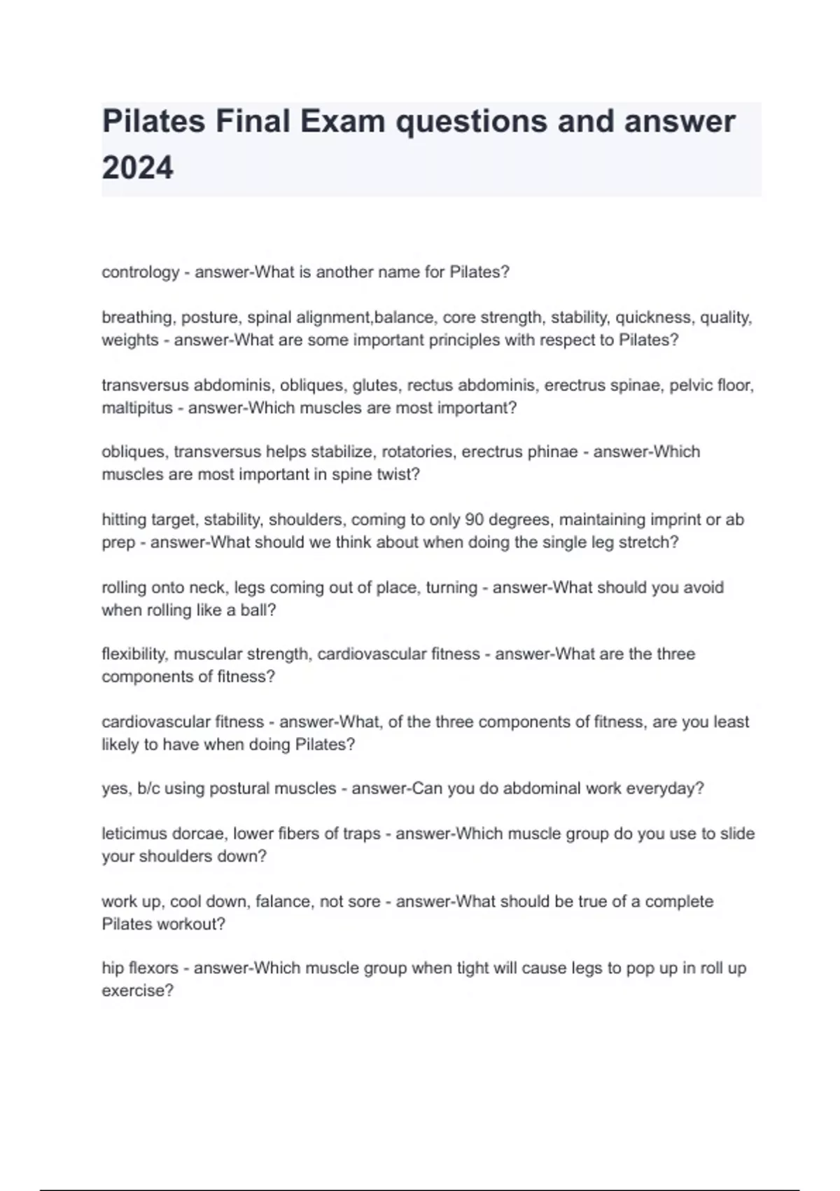 contrology - answer-What is another name for Pilates? breathing, posture, spinal alignment,balance, core strength, stability, quickness, quality, weights - answer-What are some important principles with respect to Pilates? transversus abdominis, obliques, glutes, rectus abdominis, erectrus spinae, pelvic floor, maltipitus - answer-Which muscles are most important? obliques, transversus helps stabilize, rotatories, erectrus phinae - answer-Which muscles are most important in spine twist? hitting target, stability, shoulders, coming to only 90 degrees, maintaining imprint or ab prep - answer-What should we think about when doing the single leg stretch? rolling onto neck, legs coming out of place, turning - answer-What should you avoid when rolling