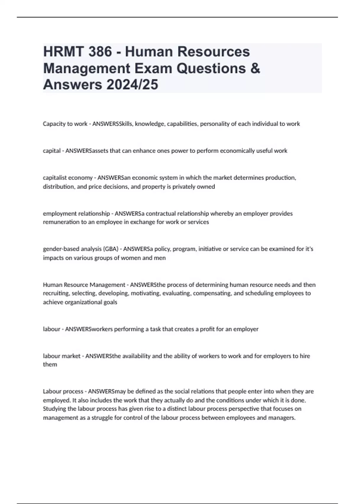 HRMT 386 - Human Resources Management Exam Questions & Answers 2024/25 Capacity to work - ANSWERSSkills, knowledge, capabilities, personality of each individual to work capital - ANSWERSassets that can enhance ones power to perform economically useful work capitalist economy - ANSWERSan economic system in which the market determines production, distribution, and price decisions, and property is privately owned employment relationship - ANSWERSa contractual relationship whereby an employer provides remuneration to an employee in exchange for work or services gender-based analysis (GBA) - ANSWERSa policy, program, initiative or service can be examined for it's impacts on various groups of women and men Human Resource Management - ANSWERSthe process of determining human resource needs and then recruiting, selecting, developing, motivating, evaluating, compensating, and scheduling employees to achieve organizational goals labour - ANSWERSworkers performing a task that creates a profit for an employer labour market - ANSWERSthe availability and the ability of workers to work and for employers to hire them Labour process - ANSWERSmay be defined as the social relations that people enter into when they are employed. It also includes the work that they actually do and the conditions under which it is done. Studying the labour process has given rise to a distinct labour process perspective that focuses on management as a struggle for control of the labour process between employees and managers.