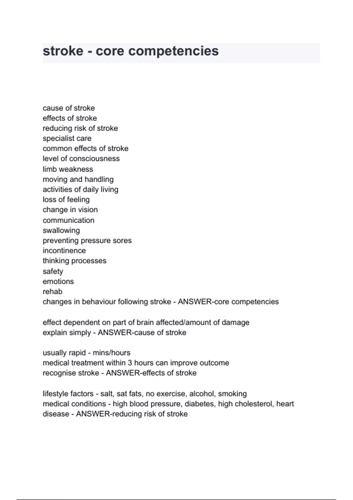cause of stroke effects of stroke reducing risk of stroke specialist care common effects of stroke level of consciousness limb weakness moving and handling activities of daily living loss of feeling change in vision communication swallowing preventing pressure sores incontinence thinking processes safety emotions rehab changes in behaviour following stroke - ANSWER-core competencies effect dependent on part of brain affected/amount of damage explain simply - ANSWER-cause of stroke usually rapid - mins/hours medical treatment within 3 hours can improve outcome recognise stroke - ANSWER-effects of stroke lifestyle factors - salt, sat fats, no exercise, alcohol, smoking medical condition