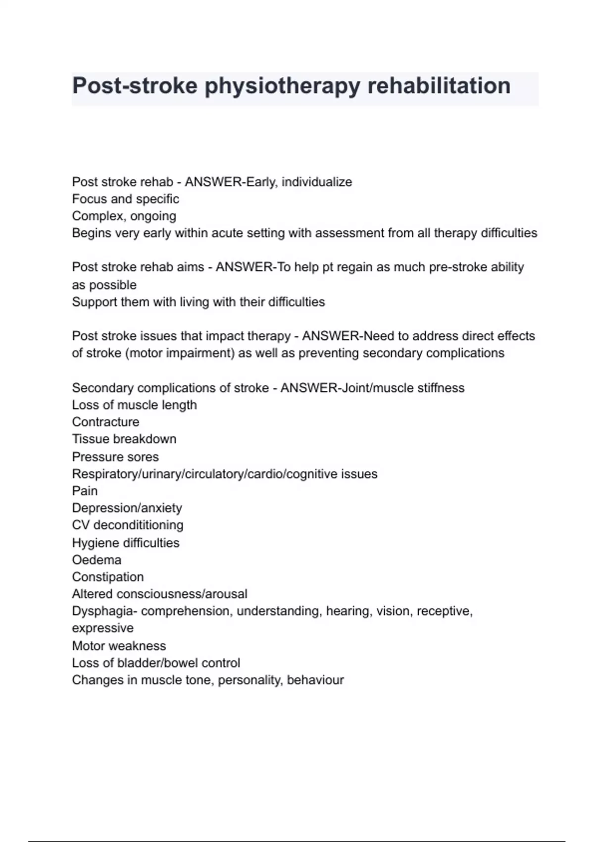 Post stroke rehab - ANSWER-Early, individualize Focus and specific Complex, ongoing Begins very early within acute setting with assessment from all therapy difficulties Post stroke rehab aims - ANSWER-To help pt regain as much pre-stroke ability as possible Support them with living with their difficulties Post stroke issues that impact therapy - ANSWER-Need to address direct effects of stroke (motor impairment) as well as preventing secondary complications Secondary complications of stroke - ANSWER-Joint/muscle stiffness Loss of muscle length Contracture Tissue breakdown Pressure sores Respiratory/urinary/circulatory/cardio/cognitive issues Pain Depression/anxiety CV decondititioning Hygiene difficulties Oedema Constipation Altered consciousness/arousal Dysphagia- comp