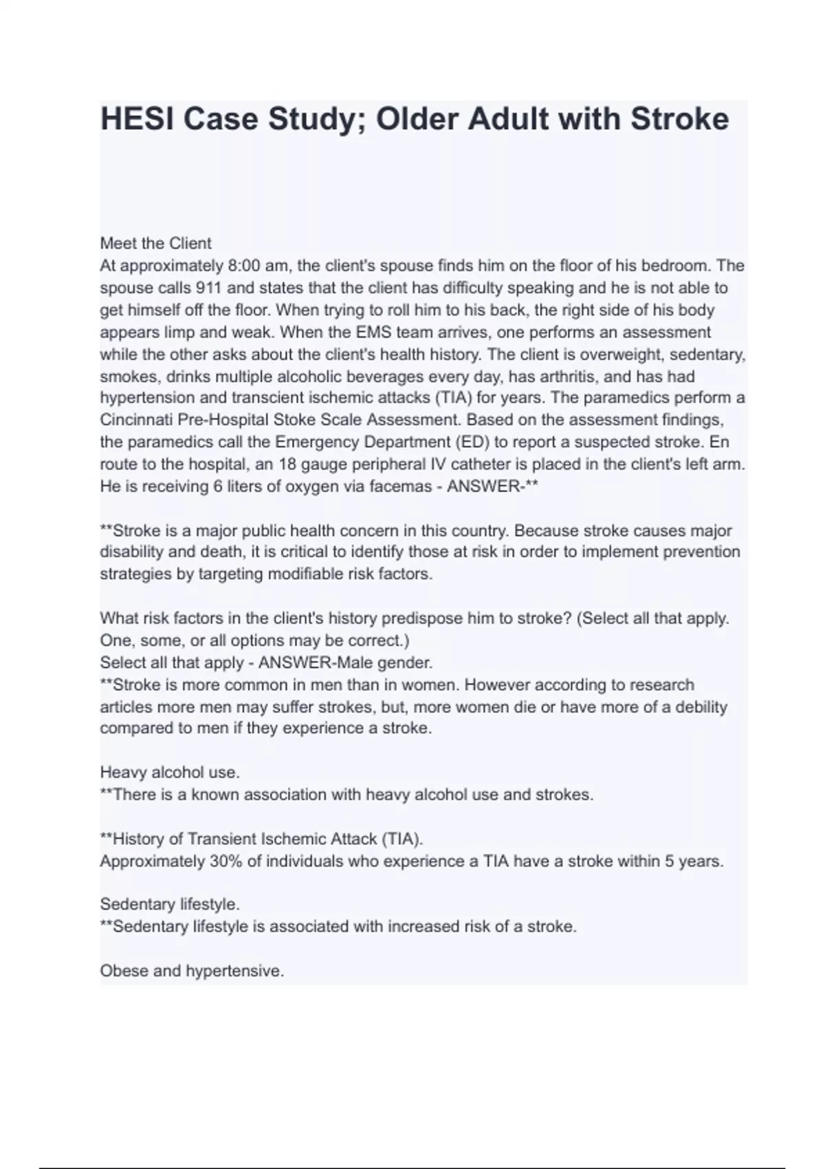 ESI Case Study; Older Adult with StrokeH Meet the Client At approximately 8:00 am, the client's spouse finds him on the floor of his bedroom. The spouse calls 911 and states that the client has difficulty speaking and he is not able to get himself off the floor. When trying to roll him to his back, the right side of his body appears limp and weak. When the EMS team arrives, one performs an assessment while the other asks about the client's health history. The client is overweight, sedentary, smokes, drinks multiple alcoholic beverages every day, has arthritis, and has had hypertension and transcient ischemic attacks (TIA) for years. The paramedics perform a Cincinnati Pre-Hospital Stoke Scale Assessment. Based on the assessment findings, the paramedics call the Emergency Department (ED) to report a suspected stroke. En route to the hospital, an 18 gauge peripheral IV catheter is placed in the client's left arm. He is receiving 6 liters of oxygen via facemas - ANSWER-** **Stroke is a major public health concern in this country. Because stroke causes major disability and death, it is critical to identify those at risk in order to implement prevention strategies by targeting modifiable risk factors. What risk factors in the client's history predispose him to stroke? (Select all that apply. One, some, or all options may be correct.) Select all that apply - ANSWER-Male gender. **Stroke is more common in men than in women. However according to research article