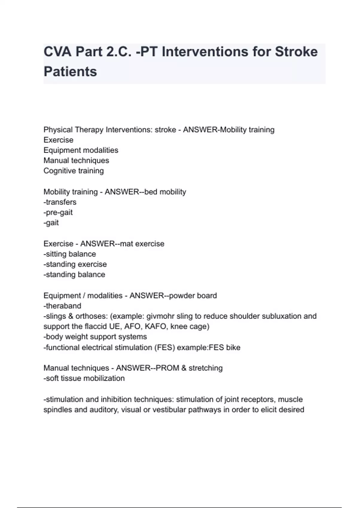 CVA Part 2.C. -PT Interventions for Stroke Patients Physical Therapy Interventions: stroke - ANSWER-Mobility training Exercise Equipment modalities Manual techniques Cognitive training Mobility training - ANSWER--bed mobility -transfers -pre-gait -gait Exercise - ANSWER--mat exercise -sitting balance -standing exercise -standing balance Equipment / modalities - ANSWER--powder board -theraband -slings & orthoses: (example: givmohr sling to reduce shoulder subluxation and support the flaccid UE, AFO, KAFO, knee cage) -body weight support systems -functional electri