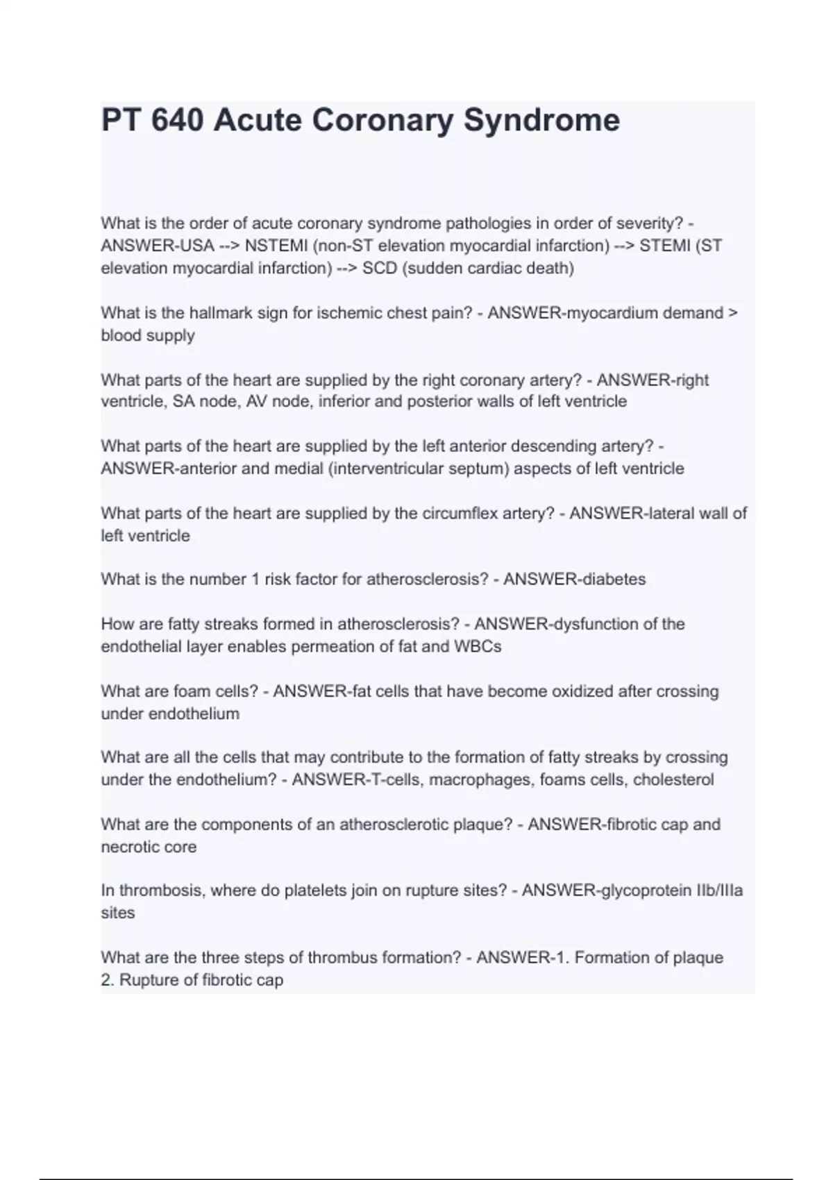 What is the order of acute coronary syndrome pathologies in order of severity? - ANSWER-USA -- NSTEMI (non-ST elevation myocardial infarction) -- STEMI (ST elevation myocardial infarction) -- SCD (sudden cardiac death) What is the hallmark sign for ischemic chest pain? - ANSWER-myocardium demand blood supply What parts of the heart are supplied by the right coronary artery? - ANSWER-right ventricle, SA node, AV node, inferior and posterior walls of left ventricle What parts of the heart are supplied by the left anterior descending artery? - ANSWER-anterior and medial (interventricular septum) aspects of left ventricle What parts of the heart are supplied by the circumflex artery? - ANSWER-lateral wall of left ventricle What is the number 1 risk factor for atherosclerosis? - ANSWER-diabetes How are fatty streaks formed in atherosclerosis? - ANSWER-dysfunction of the endothelial layer enables permeation of fat and WBCs What are foam cells? - ANSWER-fat cells that have become oxidized after crossing under endothelium What are all the cells that may contribute to the formation of fatty streaks by crossing under the endothelium? - ANSWER-T-cells, macrophages, foams cells, cholesterol What are the components of an ather
