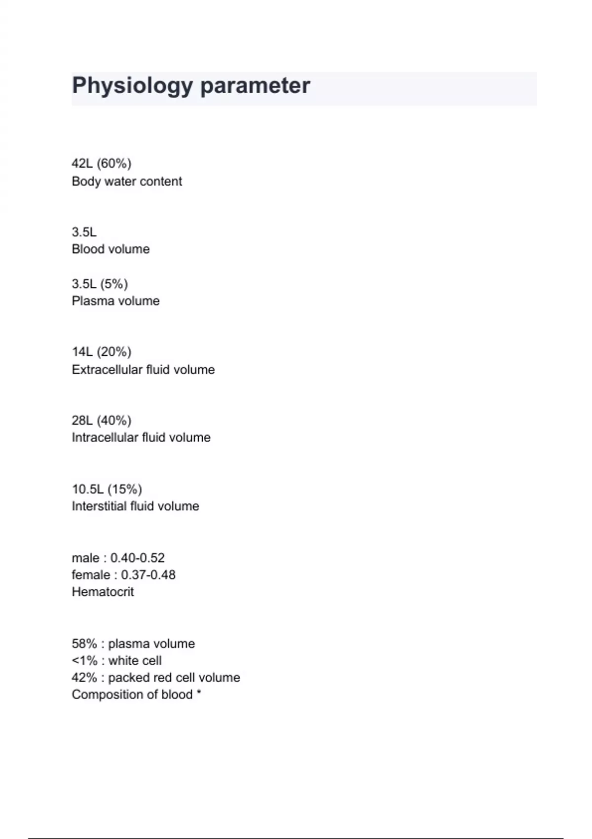 42L (60%) Body water content 3.5L Blood volume 3.5L (5%) Plasma volume 14L (20%) Extracellular fluid volume 28L (40%) Intracellular fluid volume 10.5L (15%) Interstitial fluid volume male : 0.40-0.52 female : 0.37-0.48 Hematocrit 58% : plasma volume <