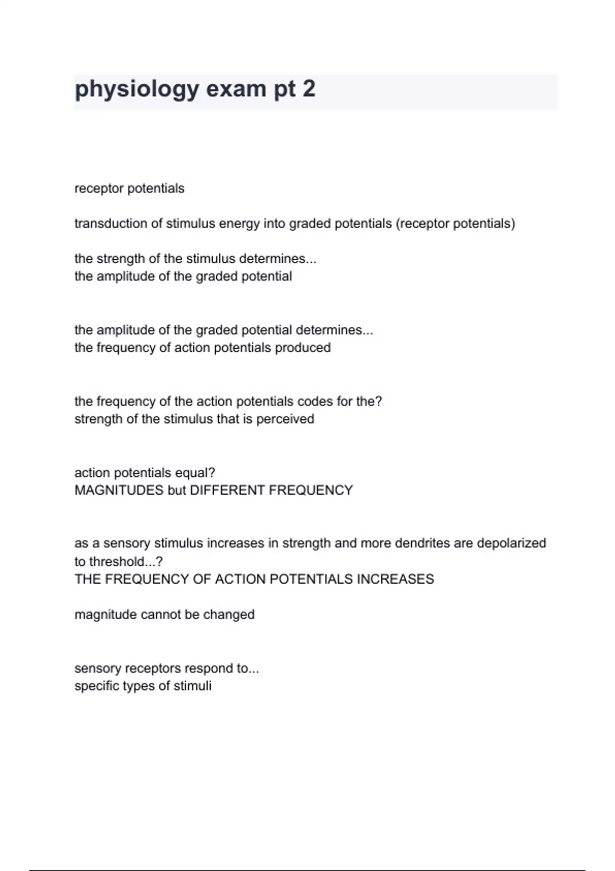 receptor potentials transduction of stimulus energy into graded potentials (receptor potentials) the strength of the stimulus determines... the amplitude of the graded potential the amplitude of the graded potential determines... the frequency of action potentials produced the frequency of the action potentials codes for the? strength of the s