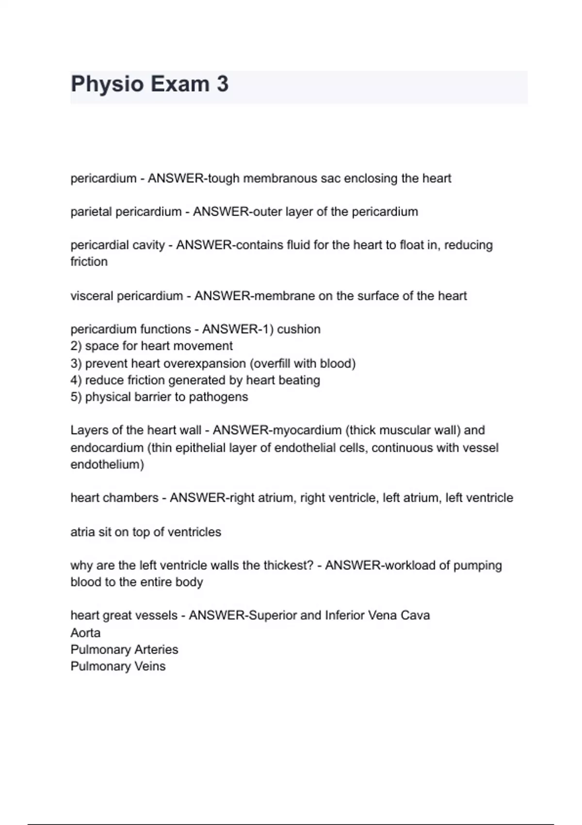 Physio Exam 3 pericardium - ANSWER-tough membranous sac enclosing the heart parietal pericardium - ANSWER-outer layer of the pericardium pericardial cavity - ANSWER-contains fluid for the heart to float in, reducing friction visceral pericardium - ANSWER-membrane on the surface of the heart pericardium functions - ANSWER-1) cushion 2) space for heart movement 3) prevent heart overexpansion (overfill with blood) 4) reduce friction generated by heart beating 5) physical barrier to pathogens Layers of the heart wall - ANSWER-myocardium (thick muscular wall) and endocardium (thin epithelial layer of endothelial cells, continuous with vessel endothelium) heart chambers - ANSWER-right atrium, right ventricle, left atrium, left ventricle atria sit on top of ventricles why are the left ventricle walls the thickest? - ANSWER-workload of pumping blood to the entire body heart great vessels - ANSWER-Superior and Inferior Vena Cava Aorta Pulmonary A