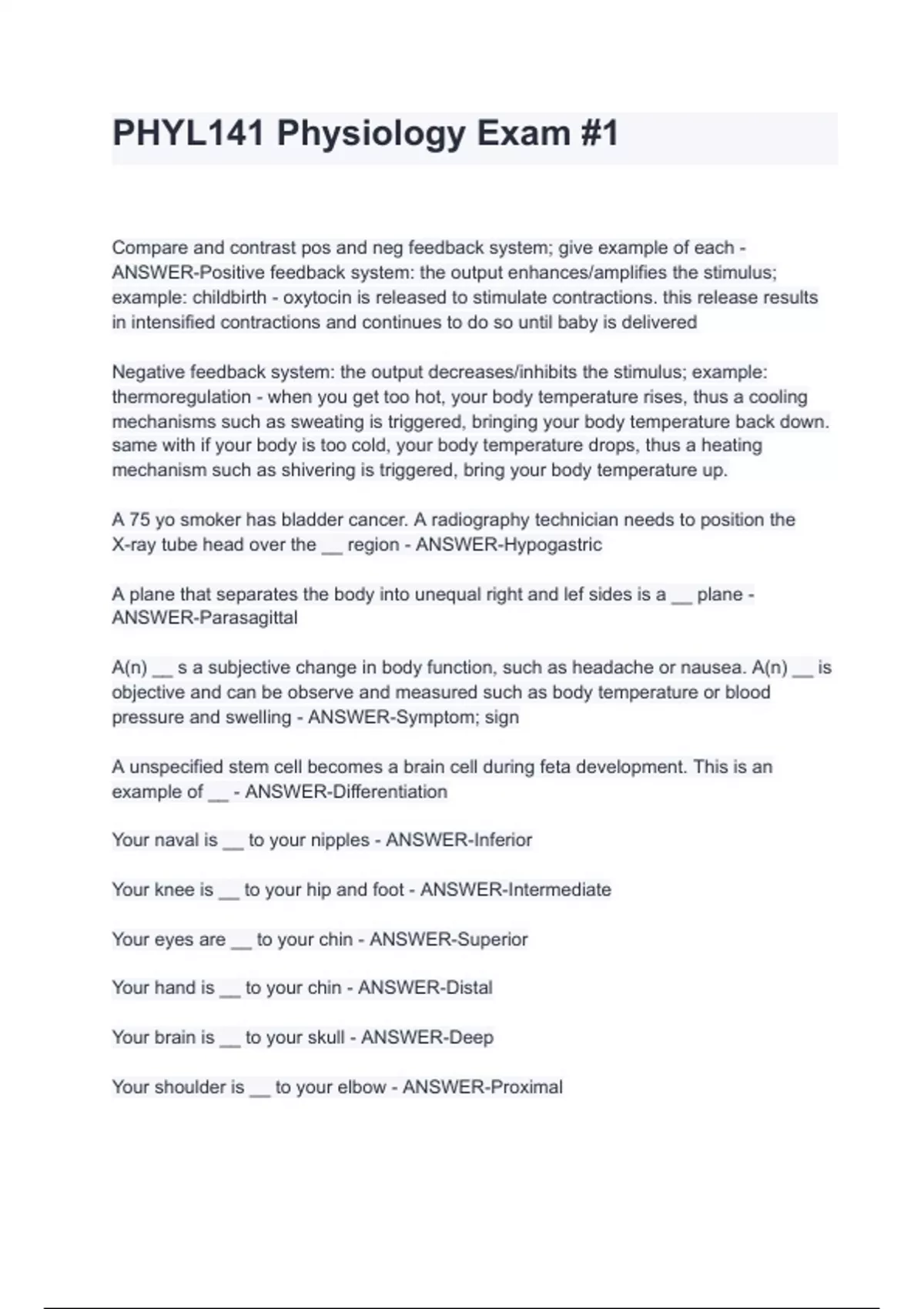 Compare and contrast pos and neg feedback system; give example of each - ANSWER-Positive feedback system: the output enhances/amplifies the stimulus; example: childbirth - oxytocin is released to stimulate contractions. this release results in intensified contractions and continues to do so until baby is delivered Negative feedback system: the output decreases/inhibits the stimulus; example: thermoregulation - when you get too hot, your body temperature rises, thus a cooling mechanisms such as sweating is triggered, bringing your body temperature back down. same with if your body is too cold, your body temperature drops, thus a heating mechanism such as shivering is triggered, bring your body temperature up. A 75 yo smoker has bladder cancer. A radiography technician needs to position the X-ray tube head over the __ region - ANSWER-Hypogastric A plane that separates the body into unequal right and lef sides is a __ plane - ANSWER-Parasagittal A(n) __ s a subjective change in body function, such as headache or nausea. A(n) __ is objective and can be observe and measured such as body temperature or blood pressure and s