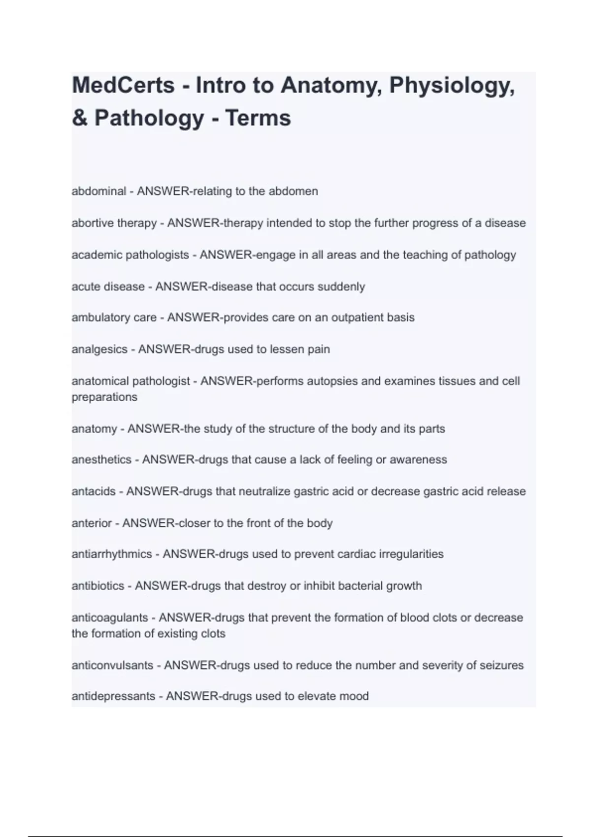 abdominal - ANSWER-relating to the abdomen abortive therapy - ANSWER-therapy intended to stop the further progress of a disease academic pathologists - ANSWER-engage in all areas and the teaching of pathology acute disease - ANSWER-disease that occurs suddenly ambulatory care - ANSWER-provides care on an outpatient basis analgesics - ANSWER-drugs used to lessen pain anatomical pathologist - ANSWER-performs autopsies and examines tissues and cell preparations anatomy - ANSWER-the study of the structure of the body and its parts anesthetics - ANSWER-drugs that cause a lack of feeling or awareness antacids - ANSWER-drugs that neutralize gastric acid or decrease gastric acid release anterior - ANSWER-closer to the front of the body antiarrhythmics - ANSWER-drugs used to prevent cardiac irregularities antibiotics - ANSWER-drugs that destroy or inhibit bacterial growth anticoagulants - ANSWER-drugs that prevent the formation of blood clots or decrease the formation of existing clots anticonvulsants - ANSWER-drugs used to reduce the number and severity of seizures antidepressants