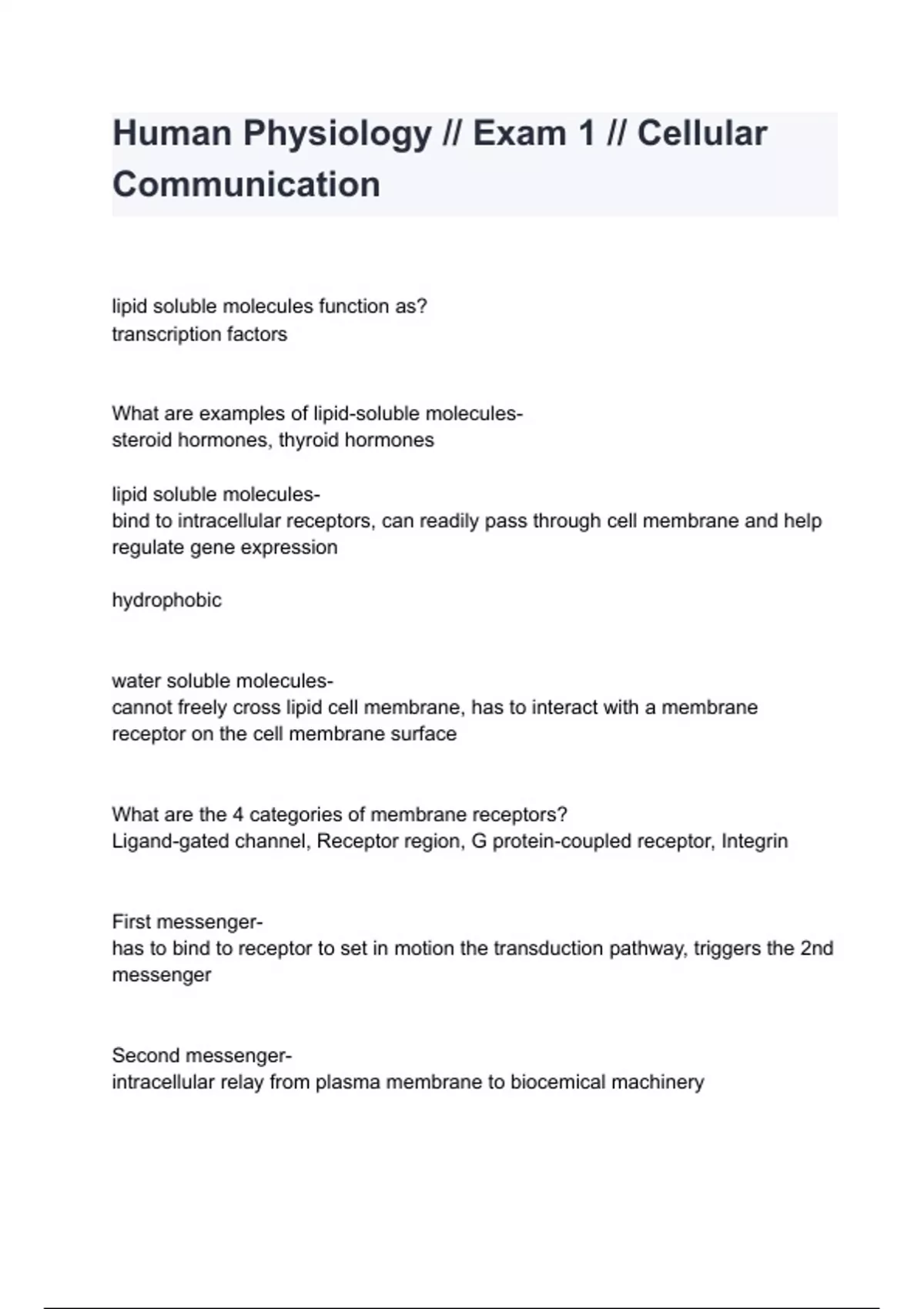 lipid soluble molecules function as? transcription factors What are examples of lipid-soluble moleculessteroid hormones, thyroid hormones lipid soluble moleculesbind to intracellular receptors, can readily pass through cell membrane and help regulate gene expression hydrophobic water soluble moleculescannot freely cross lipid cell membrane, has to interact with a membrane receptor on the cell membrane surface What are the 4 categories of membrane receptors? Ligand-gated channel, Receptor region, G protein-coupled receptor, Integrin First messengerhas to bind to receptor to set in motion the transduction pathway, triggers the 2nd messenger Second messengerintracellular relay f