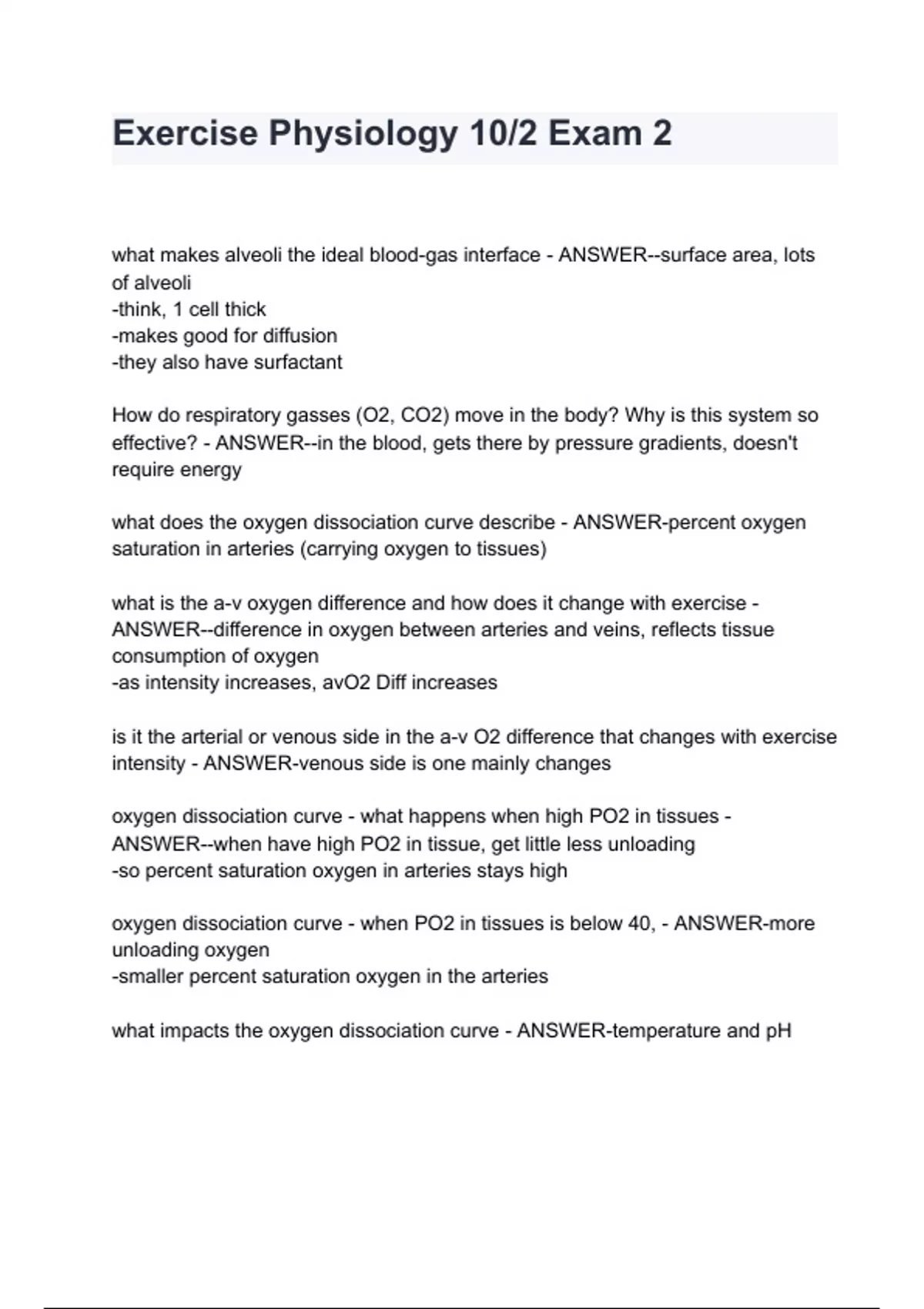 what makes alveoli the ideal blood-gas interface - ANSWER--surface area, lots of alveoli -think, 1 cell thick -makes good for diffusion -they also have surfactant How do respiratory gasses (O2, CO2) move in the body? Why is this system so effective? - ANSWER--in the blood, gets there by pressure gradients, doesn't require energy what does the oxygen dissociation curve describe - ANSWER-percent oxygen saturation in arteries (carrying oxygen to tissues) what is the a-v oxygen difference and how does it change with exercise - ANSWER--difference in oxygen between arteries and veins, reflects tissue consumption of oxygen -as intensity increases, avO2 Diff increases is it the arterial or venous side in the a-v O2 difference that changes with exercise intensity - ANSWER-venous side is one mainly changes oxygen dissociation curve - what happens when high PO2 in tissues - ANSWER--when have high PO2 in tissue, get little less unloading -so percent saturation oxygen in arteries stays high oxygen dissociation