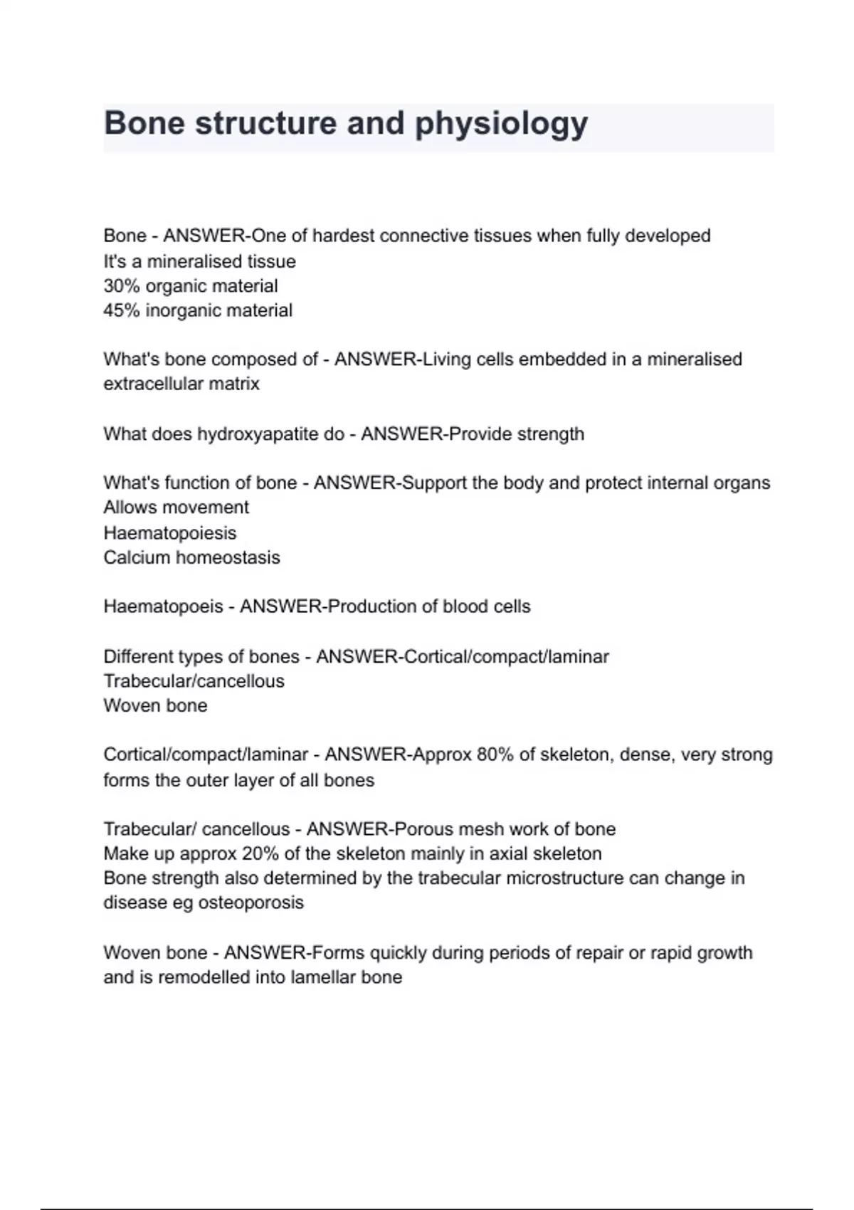 Bone - ANSWER-One of hardest connective tissues when fully developed It's a mineralised tissue 30% organic material 45% inorganic material What's bone composed of - ANSWER-Living cells embedded in a mineralised extracellular matrix What does hydroxyapatite do - ANSWER-Provide strength What's function of bone - ANSWER-Support the body and protect internal organs Allows movement Haematopoiesis Calcium homeostasis Haematopoeis - ANSWER-Production of blood cells Different types of bones - ANSWER-Cortical/compact/laminar Trabecular/cancellous Woven bone Cortical/compact/laminar - ANSWER-Approx 80% of skeleton, dense, very strong forms the outer layer of all bones Trabecular/ cancellous - ANSWER-Porous mesh work of bone Make up approx 20% of the skeleton mainly in axial skeleton Bone strength also determined by the trabecular microstructure can change in disease eg osteoporosis Woven bone - ANS