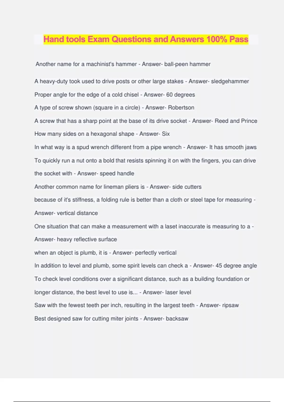 Hand tools Exam Questions and Answers 100% Pass Another name for a machinist's hammer - Answer- ball-peen hammer A heavy-duty took used to drive posts or other large stakes - Answer- sledgehammer Proper angle for the edge of a cold chisel - Answer- 60 degrees A type of screw shown (square in a circle) - Answer- Robertson A screw that has a sharp point at the base of its drive socket - Answer- Reed and Prince How many sides on a hexagonal shape - Answer- Six In what way is a spud wrench different from a pipe wrench - Answer- It has smooth jaws To quickly run a nut onto a bold that resists spinning it on with the fingers, you can drive the socket with - Answer- speed handle Another common name for lineman pliers is - Answer- side cutters because of it's stiffness, a folding rule is better than a cloth or steel tape for measuring - Answer- vertical distance