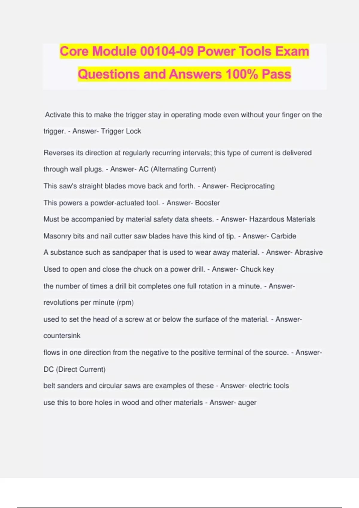 Core Module 00104-09 Power Tools Exam Questions and Answers 100% Pass Activate this to make the trigger stay in operating mode even without your finger on the trigger. - Answer- Trigger Lock Reverses its direction at regularly recurring intervals; this type of current is delivered through wall plugs. - Answer- AC (Alternating Current) This saw's straight blades move back and forth. - Answer- Reciprocating This powers a powder-actuated tool. - Answer- Booster Must be accompanied by material safety data sheets. - Answer- Hazardous Materials Masonry bits and nail cutter saw blades have this kind of tip. - Answer- Carbide A substance such as sandpaper that is used to wear away material. - Answer- Abrasive Used to open and close the chuck on a power drill. - Answer- Chuck key the number of times a drill bit completes one full rotation in a minute. - Answer- revolutions per minute (rpm) used to set the head of a screw at or below the surface of the material. - Answer- countersink
