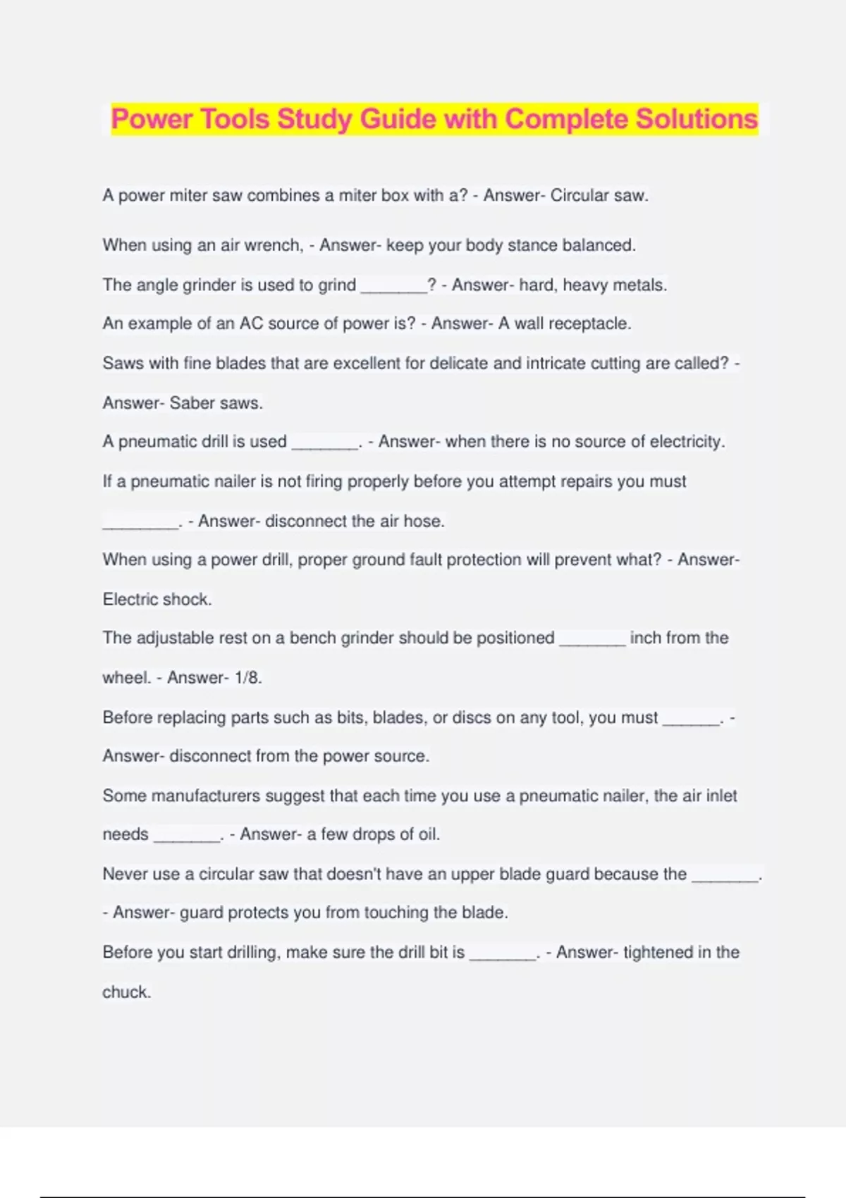 Power Tools Study Guide with Complete Solutions A power miter saw combines a miter box with a? - Answer- Circular saw. When using an air wrench, - Answer- keep your body stance balanced. The angle grinder is used to grind _______? - Answer- hard, heavy metals. An example of an AC source of power is? - Answer- A wall receptacle. Saws with fine blades that are excellent for delicate and intricate cutting are called? - Answer- Saber saws. A pneumatic drill is used _______. - Answer- when there is no source of electricity. If a pneumatic nailer is not firing properly before you attempt repairs you must ________. - Answer- disconnect the air hose. When using a power drill, proper ground fault protection will prevent what? - Answer- Electric shock. The adjustable rest on a bench grinder should be positioned _______ inch from the wheel. - Answer- 1/8. Before replacing parts such as bits, blades, or discs on any tool, you must ______. - Answer- disconnect from the power source. Some manufacturers suggest that each time you use a pneumatic nailer, the air inlet needs _______. - Answer- a few drops of oil