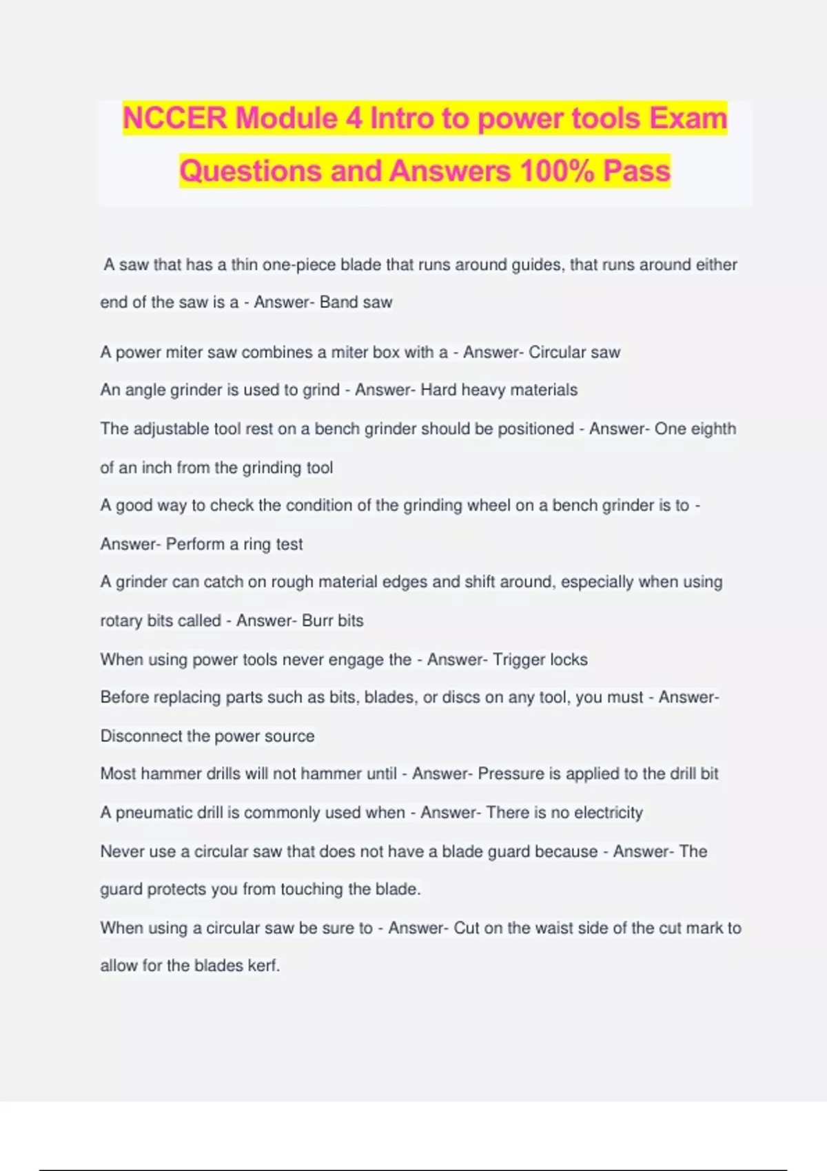 NCCER Module 4 Intro to power tools Exam Questions and Answers 100% Pass