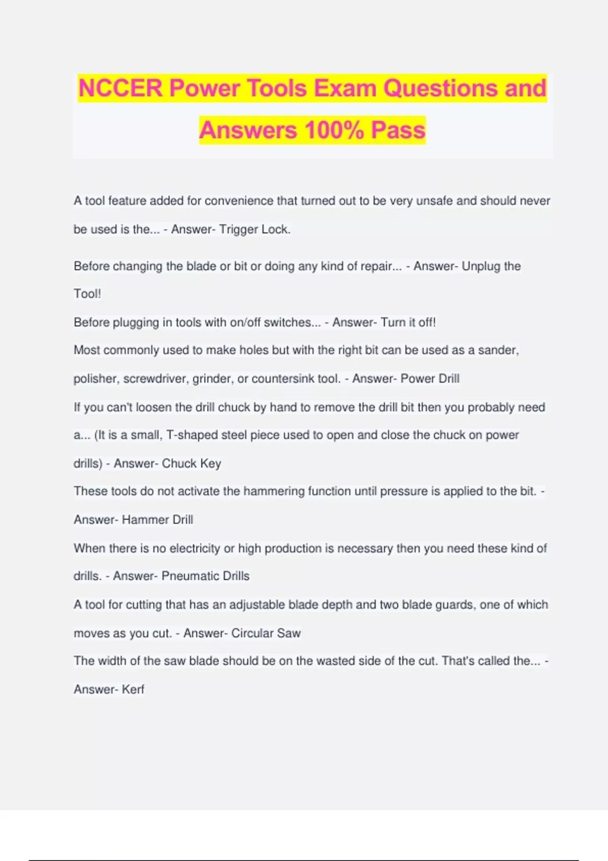 NCCER Power Tools Exam Questions and Answers 100% Pass A tool feature added for convenience that turned out to be very unsafe and should never be used is the... - Answer- Trigger Lock. Before changing the blade or bit or doing any kind of repair... - Answer- Unplug the Tool! Before plugging in tools with on/off switches... - Answer- Turn it off! Most commonly used to make holes but with the right bit can be used as a sander, polisher, screwdriver, grinder, or countersink tool. - Answer- Power Drill If you can't loosen the drill chuck by hand to remove the drill bit then you probably need a... (It is a small, T-shaped steel piece used to open and close the chuck on power drills) - Answer- Chuck Key These tools do not activate the hammering function until pressure is applied to the bit. - Answer- Hammer Drill When there is no electricity or high production is necessary then you need these kind of drills. - Answer- Pneumatic Drills A tool for cutting that has an adjustable blade depth and two blade guards, one of which moves as you cut. - Answer- Circular Saw The width of the saw blade should be on the wasted side of the cut. That's called the... - Answer- Kerf