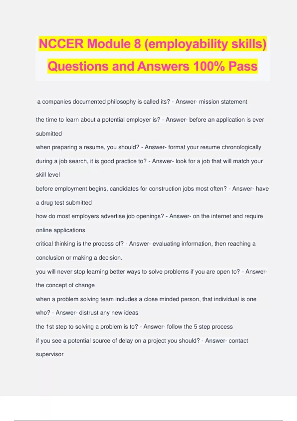 NCCER Module 8 (employability skills) Questions and Answers 100% Pass a companies documented philosophy is called its? - Answer- mission statement the time to learn about a potential employer is? - Answer- before an application is ever submitted when preparing a resume, you should? - Answer- format your resume chronologically during a job search, it is good practice to? - Answer- look for a job that will match your skill level before employment begins, candidates for construction jobs most often? - Answer- have a drug test submitted how do most employers advertise job openings? - Answer- on the internet and require online applications critical thinking is the process of? - Answer- evaluating information, then reaching a conclusion or making a decision.