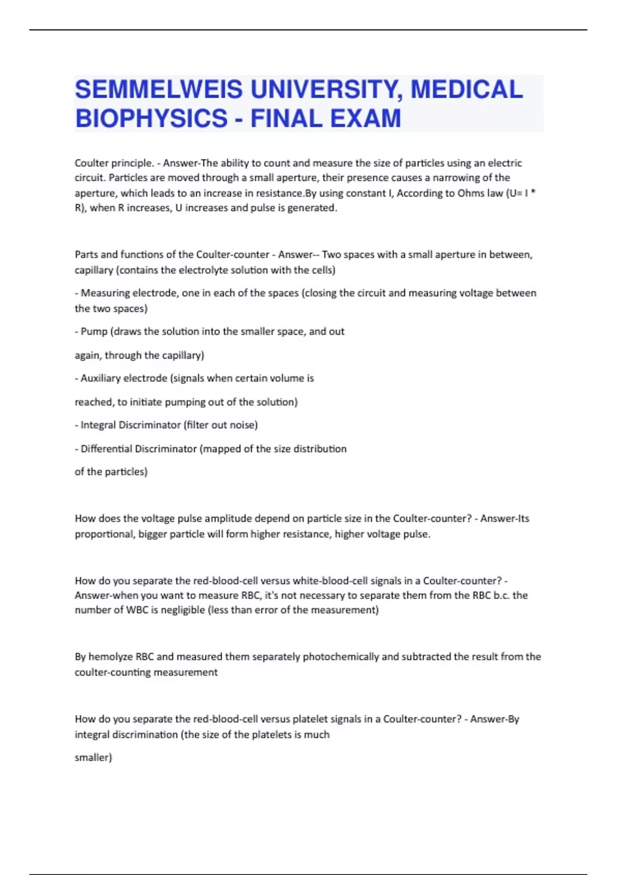 Coulter principle. - Answer-The ability to count and measure the size of particles using an electric circuit. Particles are moved through a small aperture, their presence causes a narrowing of the aperture, which leads to an increase in resistance.By using constant I, According to Ohms law (U= I * R), when R increases, U increases and pulse is generated. Parts and functions of the Coulter-counter - Answer-- Two spaces with a small aperture in between, capillary (contains the electrolyte solution with the cells) - Measuring electrode, one in each of the spaces (closing the circuit and measuring voltage between the two spaces) - Pump (draws the solution into the smaller space, and out again, through the capillary) - Auxiliary electrode (signals when certain volume is reached, to initiate pumping out of the solution) - Integral Discriminator (filter out noise) - Differential Discriminator (mapped of the size distribution of the particles) How does the voltage pulse amplitude depend on particle size in the Coulter-counter? - Answer-Its proportional, bigger particle will form higher resistance, higher voltage pulse. How do you separate the red-blood-cell versus white-blood-cell signals in a Coulter-counter? - Answer-when you want to measure RBC, it's not necessary to separate them from the RBC b.c. the number of WBC is negligible (less than error of the measurement) By hemolyze RBC and measured them separately photochemically and subtracted the result from the coulter-counting measurement How do you separate the red-blood-cell versus platelet signals in a Coulter-counter? - Answer-By integral discrimination (the size of the platelets is much smaller)What is the role of differential discriminator in Coulter-counting? - Answer-Mapping the size distribution of the particle Why is dilution of blood is necessary in Coulter-counting? - Answer-Because the cells themselves do not conduct well, and so we dilute them with an electrolyte solution so changes in resistivity are noticed. Also, for practical reasons (e.g. we don't want the solution to dry up.) What solution is used for blood dilution in Coulter-counting? - Answer-Saline solution, for optimal osmotic pressure (keep the RBCs in their natural size) and for good conduction (NaCl) How does the matter flow density (flux) change if the concentration gradient is doubled? - Answer-It doubles, due to flicks first law: Jv=-Dxdeltac/deltax Name the parameters influencing the value of diffusion coefficient. - Answer-Size and shape of the particle as well as the temperature and viscosity of the medium. Can be calculated for spherical particles: D=kT/6 pi n r What diffuses faster: a potassium ion or a virus particle? - Answer-K+ ion due to smaller diffusion coefficient (smaller size) How does the average distance travelled by a diffusing particle depend on time? - Answer-Square root function (Distance average ^2 =6 * D * t) On what length scale is diffusion an effective transport process? - Answer-On a small scale How does the minimum wavelength of the x-ray spectrum change with increasing anode voltage? - Answer-Decreases (higher voltage higher kinetic energy higher frequency spectrum) - Duane-hunt law How does the minimum wavelength of the x-ray spectrum change with increasing anode current? - Answer-Does not change What is the maximum x-ray photon energy at 50 kV anode voltage? - Answer-50 keV What elements are suitable as x-ray-tube anode material? - Answer-High melting point and high atomic number materials molybdenum(more common in medical diagnosis) and tungsten. What are the x-ray spectral lines characteristic of? - Answer-Anode material Why do we need to cool the x-ray-tube anode? - Answer-Because it heats up due to low efficiency in the conversion of high kinetic energy to x-ray. How does x-ray absorbance depend on the atomic number of absorber? - Answer-Photo Effect is the dominant attenuation process: photoeffect = micro m - Z^3 Which part of the x-ray spectrum is attenuated by filtering? - Answer-The long wavelengths (to avoid unnecessary radiation absorption, these photons and may hurt resolution due to scattering) Which is a better x-ray absorber: Al or Ag? - Answer-Element with the higher atomic number: Ag Which attenuation mechanism dominates in x-ray diagnostics? - Answer-Photoeffect What are the parts of a gamma-radiation pulse amplitude spectrum. - Answer-Noise, Compton region and photo-peak. Effect of activity on the pulse amplitude spectrum of a gamma- radiating isotope. - Answer-Increase the value of the pulse rate (y axis) Effect of anode voltage on the pulse amplitude spectrum of a gamma-radiating isotope. - Answer-The pulse-amplitude spectrum shifts to the right to higher values (x axis) Compare the pulse amplitude spectra of two different gamma- radiating isotopes. - AnswerHow can you determine the gamma energy of a radioactive isotope with a scintillation counter? - Answer-The location of the photo-peak on the x-axis indicates the energy of the gamma photon. The voltage of the photo-peak is proportional to the energy of the gamma radiation. Because during the photo-effect all the energy of the photon is converted to the primary electron.What type of discriminator is used for acquiring the pulse amplitude spectrum? - Answer-Differential discriminator (allows us to differentiate the pulse rate values): which allows us to find the photo-peak Define the human hearing range (thereshold of hearing, threshold of pain, frequency limits). - Answer-Threshold of hearing is the minimum intensity at various frequencies that a human can hear. The threshold for pain is the highest intensity that a human can hear for a short time without damage to the ear (10 W/m^2). The frequency range is between 20Hz-20kHz. Which one is louder: 50 Hz, 120 dB vs. 1 kHz, 110 dB (formula collection, isophone curves) - AnswerThey have the same loudness value Which one is louder: 30 Hz, 90 dB vs. 1 kHz, 70 phon (formula collection, isophone curves) - Answer- 1kHz