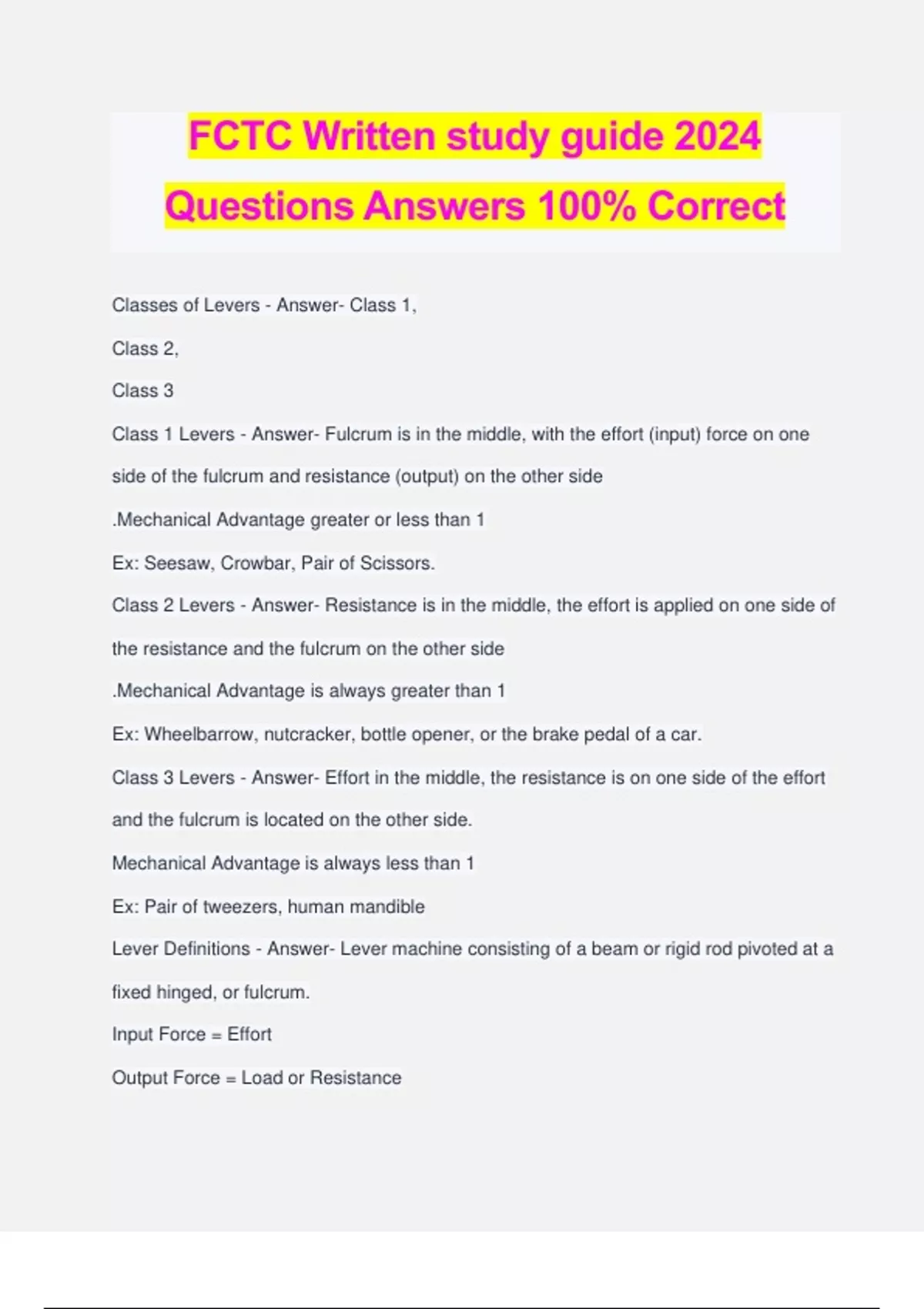 FCTC Written study guide 2024 Questions Answers 100% Correct Classes of Levers - Answer- Class 1, Class 2, Class 3 Class 1 Levers - Answer- Fulcrum is in the middle, with the effort (input) force on one side of the fulcrum and resistance (output) on the other side .Mechanical Advantage greater or less than 1 Ex: Seesaw, Crowbar, Pair of Scissors. Class 2 Levers - Answer- Resistance is in the middle, the effort is applied on one side of the resistance and the fulcrum on the other side .Mechanical Advantage is always greater than 1 Ex: Wheelbarrow, nutcracker, bottle opener, or the brake pedal of a car. Class 3 Levers - Answer- Effort in the middle, the resistance is on one side of the effort and the fulcrum is located on the other side. Mechanical Advantage is always less than 1 Ex: Pair of tweezers, human mandible Lever Definitions - Answer- Lever machine consisting of a beam or rigid rod pivoted at a fixed hinged, or fulcrum. Input Force = Effort Output Force = Load or Resistance What does "fre, 123" mean? - Answer- Fulcrum is in the middle for Class 1 LeversResistance (output) in middle for Class 2Effort (input) in the middle for Class 3 Formula for Determining the head pressure difference between an intake and output - Answer- 1 vertical foot = 0.433 psi 1 psi = 2.31 vertical feet Overall Test Overview: - Answer- 1) 30-minute period to read 2 essays- 2-hour time limit begins to answer (100 questions). 2) Watch 2 short videos and answer (20 questions) based on the scenarios. 3) Apply mechanical reasoning (25 questions, i.e. Fluid Dynamics, levers, belt and pulleys, gears) 4) Mathematical Problems (20 questions, i.e. addition, division, angles, area, volume, decimals, ratios, percentages) 5) Recall and Comprehend Technical Information (35 questions, recall from first two essays, in addition to one or two more at this time) Be mindful of questions with absolutes. What are some absolutes and why watch out for them? - Answer- Examples of absolutes are "absolutely, always, forever, completely, infinite, never, only, sole, undeniable, or wholly".Absolutes or any sort of broad statements should be suspected as wrong. Recall and Comprehend Technical Information - Answer- - Read one to four essays -35 questions total (including questions for essays in back of the test booklet) - notes can be written on the essay packet, NOT any other testing material. - 15 - 20 questions from these essays were handed out in the first 30 minutes. Gear Train, or commonly called "Transmission" - Answer- Two or more gears working in a sequence, producing mechanical advantage through a gear ratio. Relationship between Speed, Torque, and Power: - Answer- Power = 2pi x Speed (w) x Torque (nm)/ 60 Torque = 60 x Power (kW)/2pi x Speed (Rpm) Belt and Pulley Systems - Answer- Two or more pulleys in common to a belt. If the pulleys are of differing pitch diameters, a mechanical advantage is realized. Doesn't depend on ratio of teeth as with gears and sprockets, only pitch diameter. What is a pulley (also called a "sheave" or "drum") - Answer- A pulley is a wheel on an axle or shaft that is designed to support movement and change in direction of a belt or cable along its circumference. For a Rope and Pulley System that is a Block and Tackle, is characterized by: - Answer- * If the rope does not dissipate or store energy, then its mechanical advantage is the number of parts of the rope that act on the load.- if the anchor knot is at the load ("A", "D", and "E") then the mechanical advantage will be odd. (1:1, 3:1, 5:1, etc.)- if the anchor knot is at the anchor ("B", "C") then the mechanical advantage will be even. (2:1, 4:1, 6:1, etc.)- to calculate haul distance, multiply the distance need to go by the mechanical advantage. (3:1 ratio, 20 ft to haul, multiply 3 x 20 ft to get a total of 60ft) How much water can be held in engine 17 water tank - Answer- 105 feet Sq How many gallons with a tank of 12 ft diameter hold if it is 5 feet deep - Answer- 4320 Engine carries lots of hose. 4" was removed - Answer- 30% left How many acres were burned - Answer- 6.88 acres How many cubic feet of water can a captain expect the tank to hold - Answer- 1385 What is the total percentage of the body burned - Answer- 22..5 What is the minimum length of ladder to reach the roof of a 3 story house - Answer- 40ft Total chain that crew cuts - Answer- 6 chains each Average money for dinner - Answer- 14.29 How many 2 pints will go in 5 gallon drum - Answer- 20 pints Fire increase from - Answer- 145%