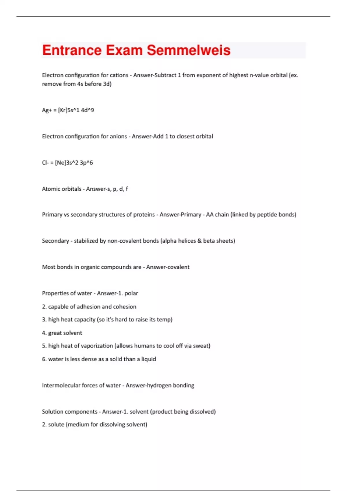 Electron configuration for cations - Answer-Subtract 1 from exponent of highest n-value orbital (ex. remove from 4s before 3d) Ag+ = [Kr]5s^1 4d^9 Electron configuration for anions - Answer-Add 1 to closest orbital Cl- = [Ne]3s^2 3p^6 Atomic orbitals - Answer-s, p, d, f Primary vs secondary structures of proteins - Answer-Primary - AA chain (linked by peptide bonds) Secondary - stabilized by non-covalent bonds (alpha helices & beta sheets) Most bonds in organic compounds are - Answer-covalent Properties of water - Answer-1. polar 2. capable of adhesion and cohesion 3. high heat capacity (so it's hard to raise its temp) 4. great solvent 5. high heat of vaporization (allows humans to cool off via sweat) 6. water is less dense as a solid than a liquid Intermolecular forces of water - Answer-hydrogen bonding Solution components - Answer-1. solvent (product being dissolved) 2. solute (medium for dissolving solvent)Molarity - Answer-the number of moles of solute per liter of solution Solubility rules - Answer-SOLUBLE 1. alkali metals (group 1) & NH4+ cations 2. NO3- or CH3COO- anions 3. Cl, Br, I (except when bonded to Ag+, Pb2+ or Hg2+) 4. sulfate ions (except when with Ca2+, Sr2+, Ba2+, Pb2+) INSOLUBLE 1. Metal oxides (except CaO, SrO, BaO) 2. Hydroxides (except when with Ca2+, Sr2+, Ba2+) 3. Carbonates, phosphates, sulfides, and sulfites (unless bound to alkali metal or NH4+) Solubility product - Answer-Ksp = [A]^a[B]^b **only products because we don't include solids in the equilibrium expression for NaCl - Ksp = x^2 for PbCl2 - Ksp = 4x^3 for Cr(OH)3 - Ksp = 27x^4 Large Ksp means - Answer-strong electrolyte (more soluble) Strong acids - Answer-So I brought no clean clothes 1. H2SO42. HI 3. HBr 4. HNO3 5. HCl 6. HClO4 7. HClO3 Strong bases - Answer-1. NaOH 2. LiOH 3. KOH 4. CsOH 5. RbOH 6. Ba(OH)2 7. Ca(OH)2 8. Sr(OH)2