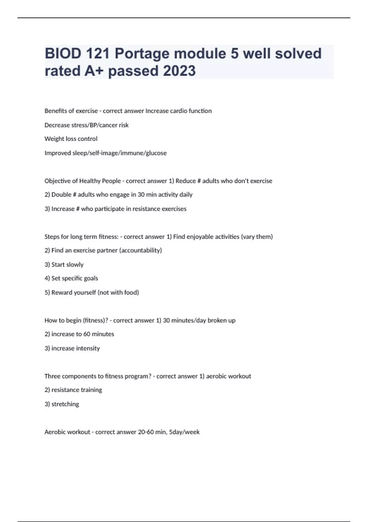 BIOD 121 Portage Module 5 Well Solved Rated A Exam Questions 2024. Benefits of exercise - correct answer Increase cardio function Decrease stress/BP/cancer risk Weight loss control Improved sleep/self-image/immune/glucose Objective of Healthy People - correct answer 1) Reduce # adults who don't exercise 2) Double # adults who engage in 30 min activity daily 3) Increase # who participate in resistance exercises Steps for long term fitness: - correct answer 1) Find enjoyable activities (vary them) 2) Find an exercise partner (accountability) 3) Start slowly 4) Set specific goals 5) Reward yourself (not with food) How to begin (fitness)? - correct answer 1) 30 minutes/day broken up 2) increase to 60 minutes 3) increase intensity Three components to fitness program? - correct answer 1) aerobic workout 2) resistance training 3) stretching Aerobic workout - correct answer 20-60 min, 5day/week