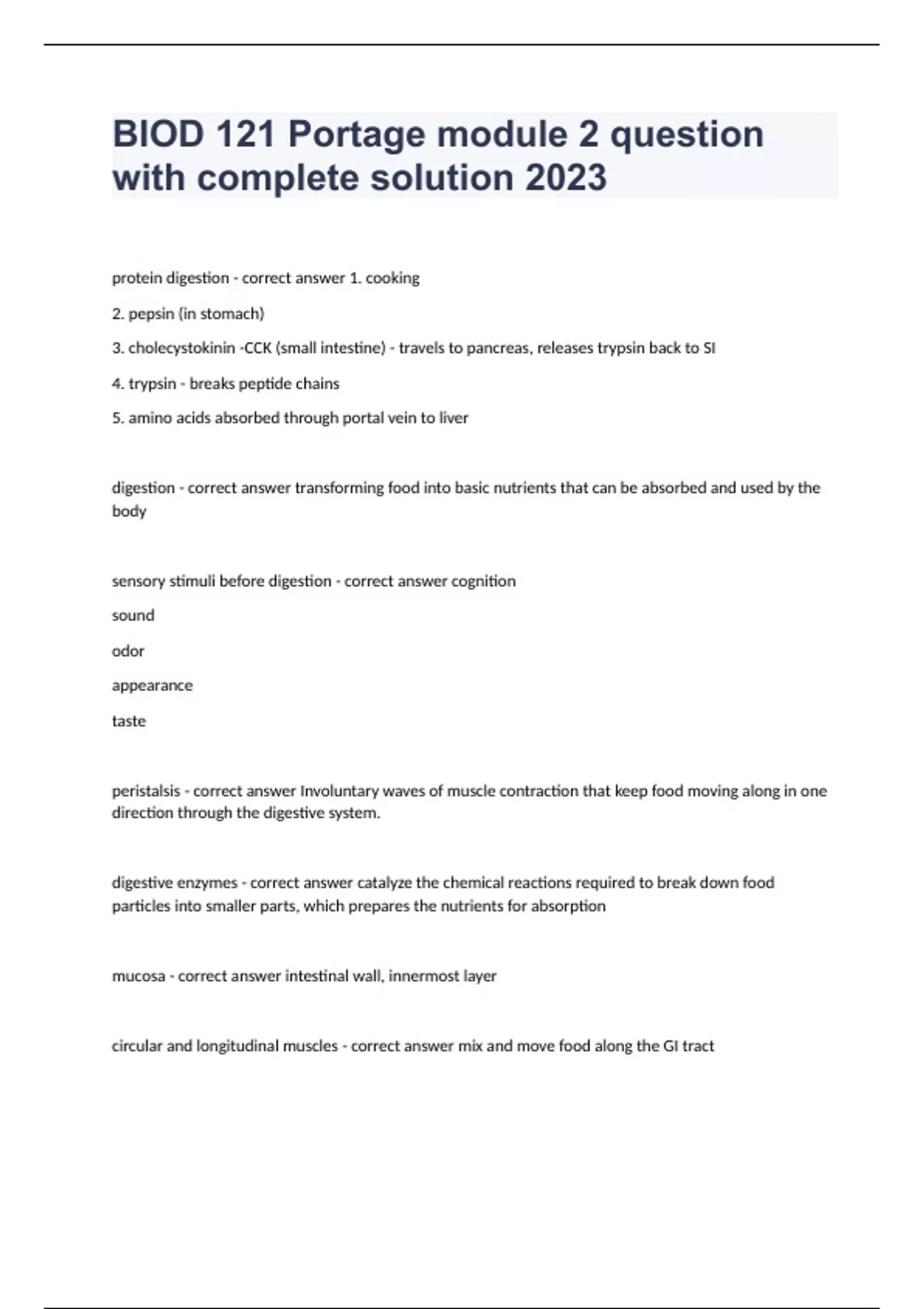 BIOD 121 Portage Module 2 Question With Complete Exam Solution 2024. protein digestion - correct answer 1. cooking 2. pepsin (in stomach) 3. cholecystokinin -CCK (small intestine) - travels to pancreas, releases trypsin back to SI 4. trypsin - breaks peptide chains 5. amino acids absorbed through portal vein to liver digestion - correct answer transforming food into basic nutrients that can be absorbed and used by the body sensory stimuli before digestion - correct answer cognition sound odor appearance taste peristalsis - correct answer Involuntary waves of muscle contraction that keep food moving along in one direction through the digestive system. digestive enzymes - correct answer catalyze the chemical reactions required to break down food particles into smaller parts, which prepares the nutrients for absorption mucosa - correct answer intestinal wall, innermost layer circular and longitudinal muscles - correct answer mix and move food along the GI tract