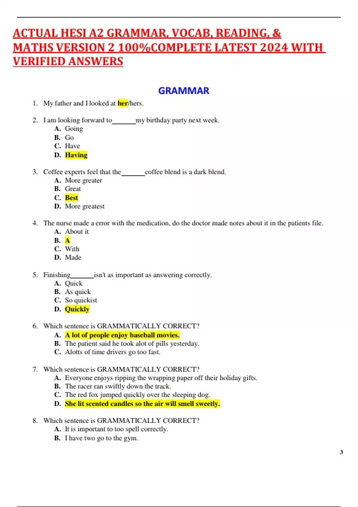 - ACTUAL HESI A2 GRAMMAR, VOCAB, READING, & MATHS VE