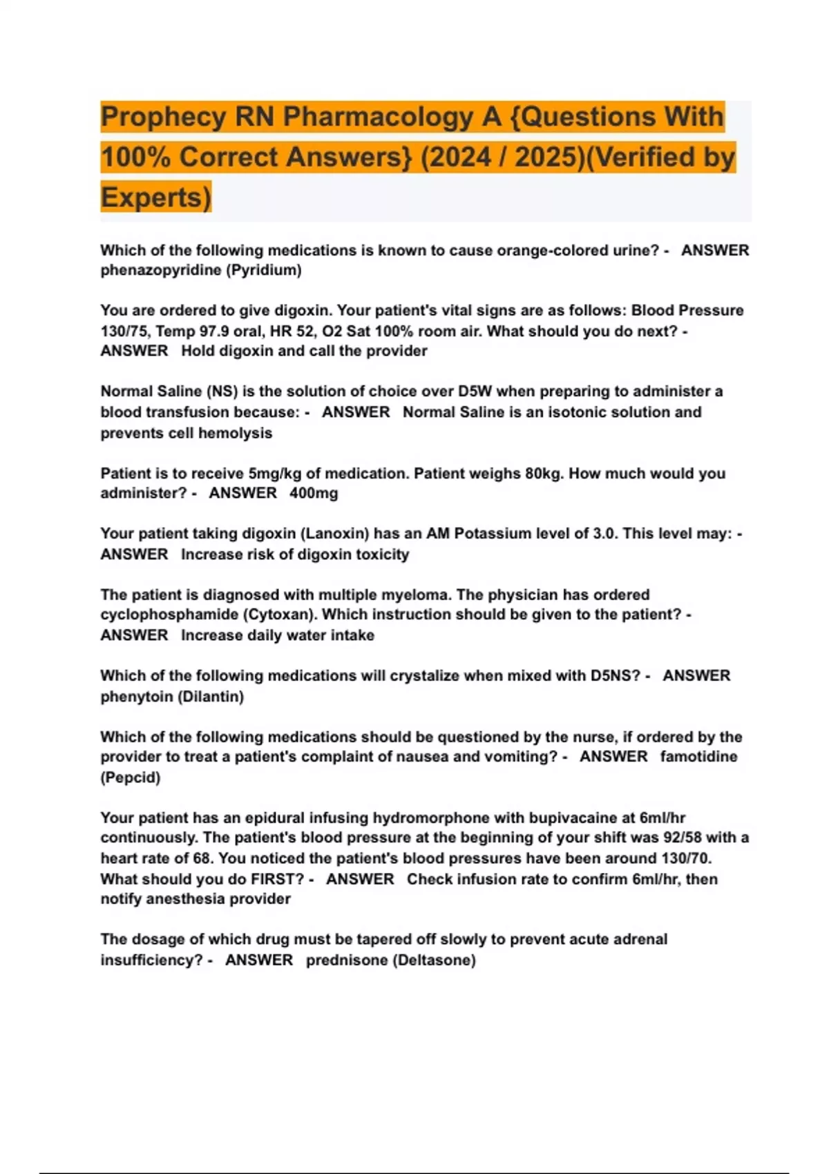 Which of the following medications is known to cause orange-colored urine? - ANSWER phenazopyridine (Pyridium) You are ordered to give digoxin. Your patient's vital signs are as follows: Blood Pressure 130/75, Temp 97.9 oral, HR 52, O2 Sat 100% room air. What should you do next? - ANSWER Hold digoxin and call the provider Normal Saline (NS) is the solution of choice over D5W when preparing to administer a blood transfusion because: - ANSWER Normal Saline is an isotonic solution and prevents cell hemolysis Patient is to receive 5mg/kg of medication. Patient weighs 80kg. How much would you administer? - ANSWER 400mg