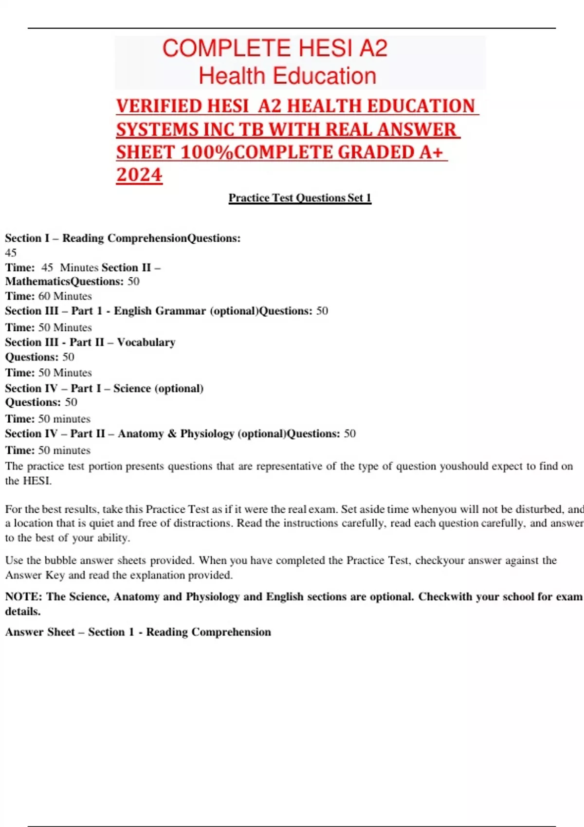 VERIFIED HESI A2 HEALTH EDUCATION SYSTEMS INC TB WITH REAL ANSWER SHEET 100%COMPLETE GRADED A+ 2024