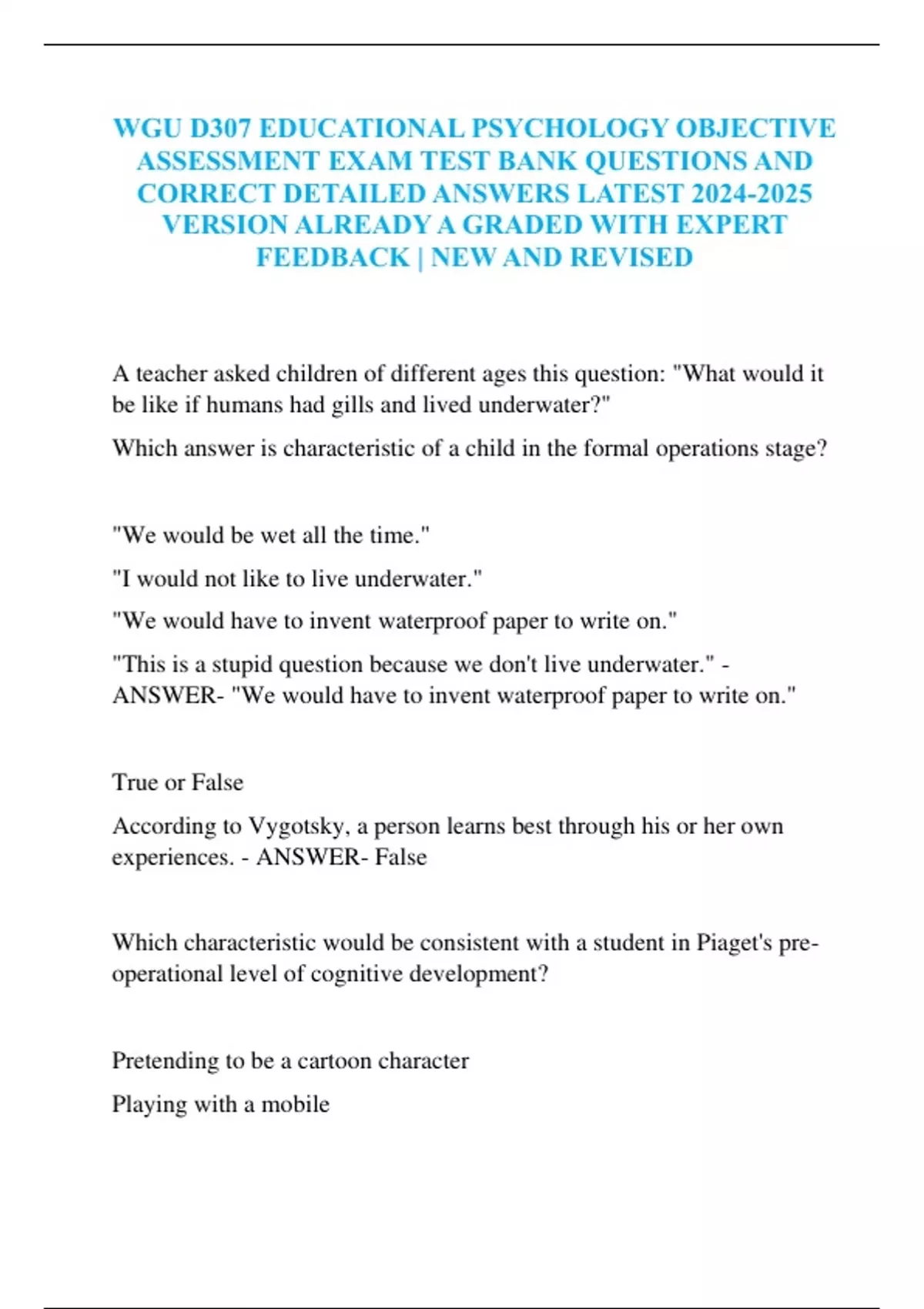 WGU D307 EDUCATIONAL PSYCHOLOGY OBJECTIVE ASSESSMENT EXAM TEST BANK QUESTIONS AND CORRECT DETAILED ANSWERS LATEST VERSION ALREADY A GRADED WITH EXPERT FEEDBACK | NEW AND REVISED