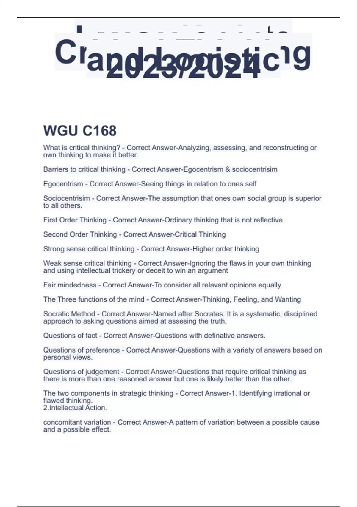 2023/2024Latest Update WGU C168 Critical Thinking and Logistic WGU C168 What is critical thinking? - Correct Answer-Analyzing, assessing, and reconstructing or own thinking to make it better. Barriers to critical thinking - Correct Answer-Egocentrism & sociocentrisim Egocentrism - Correct Answer-Seeing things in relation to ones self Sociocentrisim - Correct Answer-The assumption that ones own social group is superior to all others. First Order Thinking - Correct Answer-Ordinary thinking that is not reflective Second Order Thinking - Correct Answer-Critical Thinking Strong sense critical thinking - Correct Answer-Higher order thinking Weak sense critical thinking - Correct Answer-Ignoring the flaws in your own thinking and using intellectual trickery or deceit to win an argument Fair mindedness - Correct Answer-To consider all relavant opinions equally The Three functions of the mind - Correct Answer-Thinking, Feeling, and Wanting Socratic Method - Correct Answer-Named after Socrates. It is a systematic, disciplined approach to asking questions aimed at assesing the truth. Questions of fact - Correct Answer-Questions with definative answers. Questions of preference - Correct Answer-Questions with a variety of answers based on personal views. Questions of judgement - Correct Answer-Questions that require critical thinking as there is more than one reasoned answer but one is likely better than the other. The two components in strategic thinking - Correct Answer-1. Identifying irrational or flawed thinking. 2.Intellectual Action.