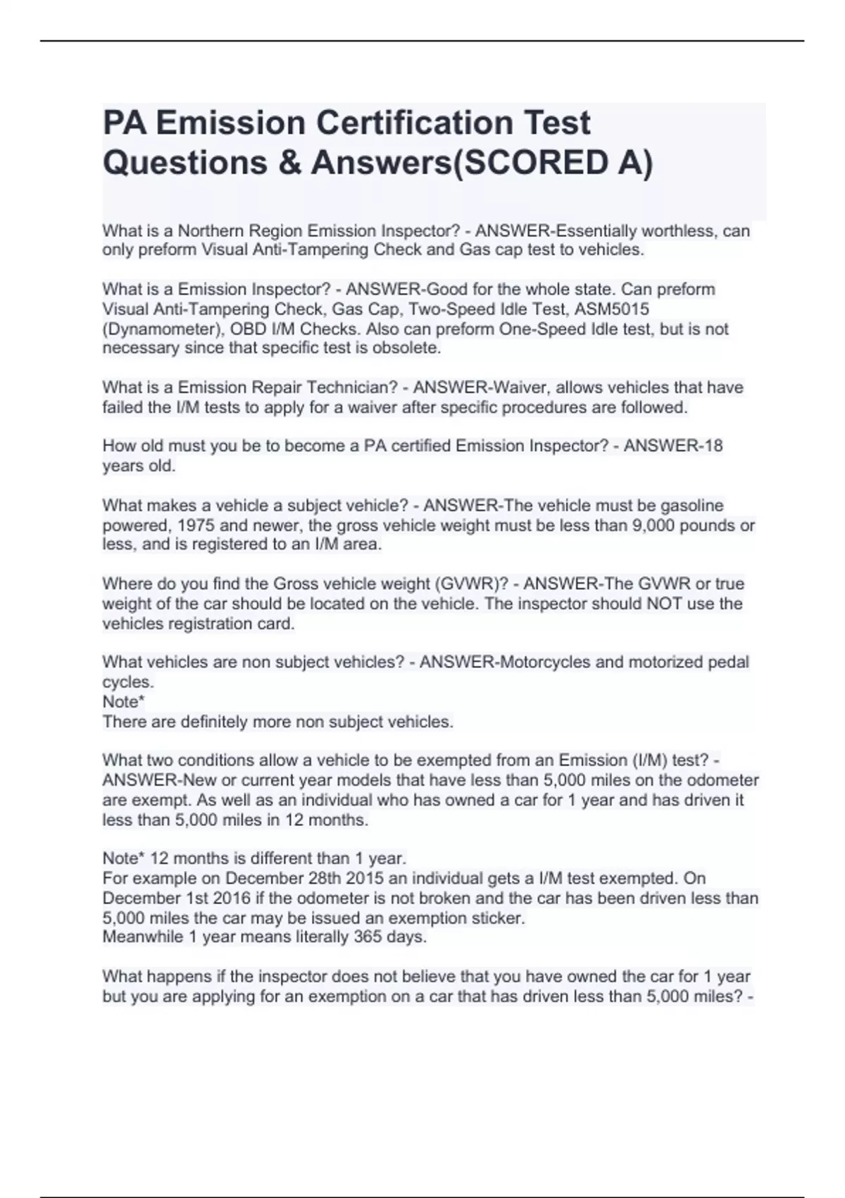 What is a Emission Inspector? - ANSWER-Good for the whole state. Can preform Visual Anti-Tampering Check, Gas Cap, Two-Speed Idle Test, ASM5015 (Dynamometer), OBD I/M Checks. Also can preform One-Speed Idle test, but is not necessary since that specific test is obsolete. What is a Emission Repair Technician? - ANSWER-Waiver, allows vehicles that have failed the I/M tests to apply for a waiver after specific procedures are followed. How old must you be to become a PA certified Emission Inspector? - ANSWER-18 years old. What makes a vehicle a subject vehicle? - ANSWER-The vehicle must be gasoline powered, 1975 and newer, the gross vehicle weight must be less than 9,000 pounds or less, and is registered to an I/M area. Where do you find the Gross vehicle weight (GVWR)? - ANSWER-The GVWR or true weight of the car should be located on the vehicle. The inspector should NOT use the vehicles registration card. What vehicles are non subject vehicles? - ANSWER-Motorcycles and motorized pedal cycles. Note* There are definitely more non subject vehicles. What two conditions allow a vehicle to be exempted from an Emission (I/M) test? - ANSWER-New or current year models that have less than 5,000 miles on the odometer are exempt. As well as an individual who has owned a car for 1 year and has driven it less than 5,000 miles in 12 months. Note* 12 months is different than 1 year. For example on December 28th 2015 an individual gets a I/M test exempted. On December 1st 2016 if the odometer is not broken and the car has been driven less than 5,000 miles the car may be issued an exemption sticker. Meanwhile 1 year means literally 365 days.