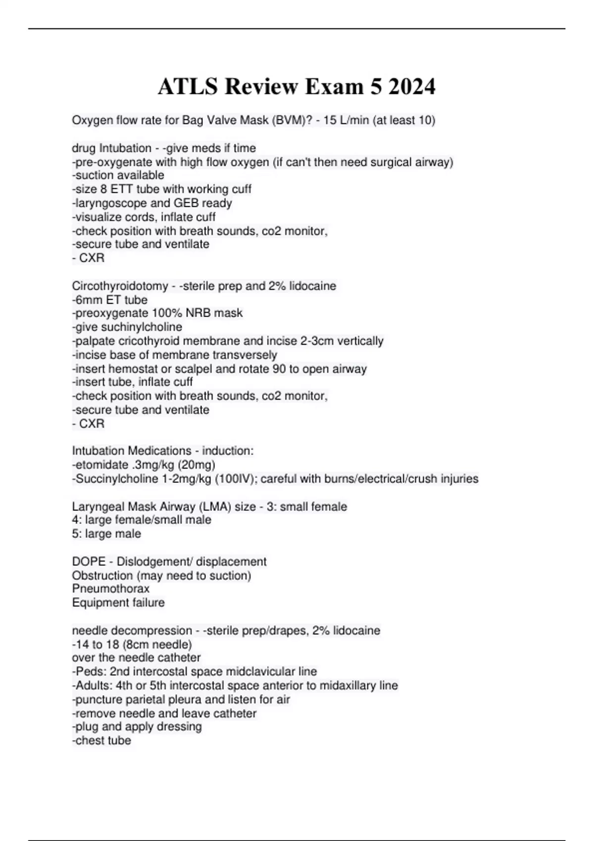 Oxygen flow rate for Bag Valve Mask (BVM)? - 15 L/min (at least 10) drug Intubation - -give meds if time -pre-oxygenate with high flow oxygen (if can't then need surgical airway) -suction available -size 8 ETT tube with working cuff -laryngoscope and GEB ready -visualize cords, inflate cuff -check position with breath sounds, co2 monitor, -secure tube and ventilate - CXR Circothyroidotomy - -sterile prep and 2% lidocaine -6mm ET tube -preoxygenate 100% NRB mask -give suchinylcholine -palpate cricothyroid membrane and incise 2-3cm vertically -incise base of membrane transversely -insert hemostat or scalpel and rotate 90 to open airway -insert tube, inflate cuff -check position with breath sounds, co2 monitor, -secure tube and ventilate - CXR Intubation Medications - induction: -etomidate .3mg/kg (20mg) -Succinylcholine 1-2mg/kg (100IV); careful with burns/electrical/crush injuries Laryngeal Mask Airway (LMA) size - 3: small female 4: large female/small male 5: large male DOPE - Dislodgement/ displacement Obstruction (may need to suction) Pneumothorax Equipment failure needle decompression - -sterile prep/drapes, 2% lidocaine -14 to 18 (8cm needle) over the needle catheter -Peds: 2nd intercostal space midclavicular line -Adults: 4th or 5th intercostal space anterior to midaxillary line -puncture parietal pleura and listen for air -remove needle and leave catheter -plug and apply dressing -chest tube chest tube - 28-32 French tube at 5th intercostal space just anterior to midaxillary line -transverse incision, puncture parietal pleura with curved Kelly above rib -enlarge and clear space with finger -advance clamped tube into apex -look for logging and listen for air movement -secure with sutures and connect under h20 seal -apply dressing, order CXR -immediate return of more then 1500mL indicates need for urgent thoracotomy or also if 200mL/hr for 2-4 hrs -color of blood is POOR predictor -injuries to mediastinal box should alert need for possible thoracotomy -acute hemothorax big enough to see on CXR may be treated with chest tube GCS scoring points - Eyes -4 Open spontaneously -3 Opens on verbal -2 Opens on pain -1 Unresponsive Speach -5 Speaks spontaneously, makes sense -4 Speaks spontaneously, but is confused -3 Speaks spontaneously, does NOT make sense