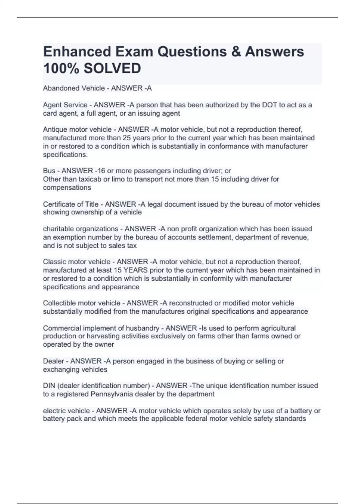 Agent Service - ANSWER -A person that has been authorized by the DOT to act as a card agent, a full agent, or an issuing agent Antique motor vehicle - ANSWER -A motor vehicle, but not a reproduction thereof, manufactured more than 25 years prior to the current year which has been maintained in or restored to a condition which is substantially in conformance with manufacturer specifications. Bus - ANSWER -16 or more passengers including driver; or Other than taxicab or limo to transport not more than 15 including driver for compensations Certificate of Title - ANSWER -A legal document issued by the bureau of motor vehicles showing ownership of a vehicle charitable organizations - ANSWER -A non profit organization which has been issued an exemption number by the bureau of accounts settlement, department of revenue, and is not subject to sales tax Classic motor vehicle - ANSWER -A motor vehicle, but not a reproduction thereof, manufactured at least 15 YEARS prior to the current year which has been maintained in or restored to a condition which is substantially in conformity with manufacturer specifications and appearance Collectible motor vehicle - ANSWER -A reconstructed or modified motor vehicle substantially modified from the manufactures original specifications and appearance Commercial implement of husbandry - ANSWER -Is used to perform agricultural production or harvesting activities exclusively on farms other than farms owned or operated by the owner