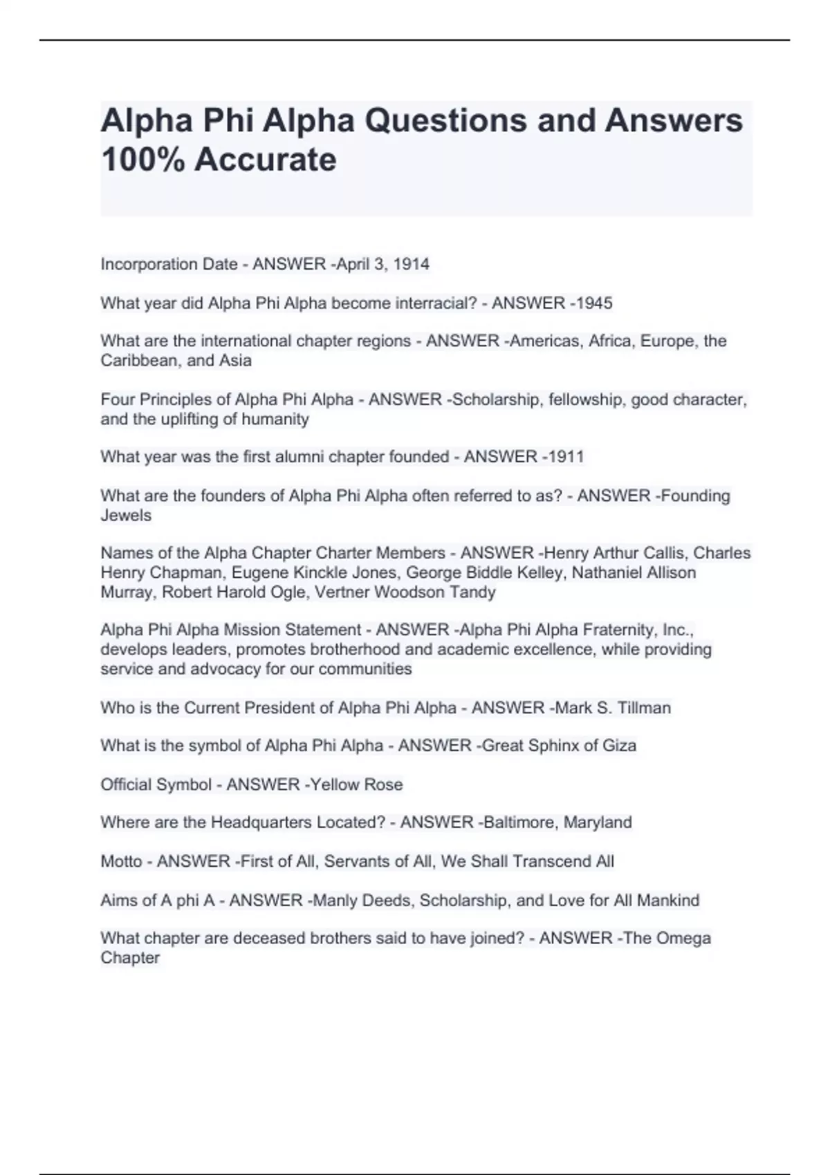 What are the international chapter regions - ANSWER -Americas, Africa, Europe, the Caribbean, and Asia Four Principles of Alpha Phi Alpha - ANSWER -Scholarship, fellowship, good character, and the uplifting of humanity What year was the first alumni chapter founded - ANSWER -1911 What are the founders of Alpha Phi Alpha often referred to as? - ANSWER -Founding Jewels Names of the Alpha Chapter Charter Members - ANSWER -Henry Arthur Callis, Charles Henry Chapman, Eugene Kinckle Jones, George Biddle Kelley, Nathaniel Allison Murray, Robert Harold Ogle, Vertner Woodson Tandy Alpha Phi Alpha Mission Statement - ANSWER -Alpha Phi Alpha Fraternity, Inc., develops leaders, promotes brotherhood and academic excellence, while providing service and advocacy for our communities Who is the Current President of Alpha Phi Alpha - ANSWER -Mark S. Tillman What is the symbol of Alpha Phi Alpha - ANSWER -Great Sphinx of Giza Official Symbol - ANSWER -Yellow Rose Where are the Headquarters Located? - ANSWER -Baltimore, Maryland Motto - ANSWER -First of All, Servants of All, We Shall Transcend All Aims of A phi A - ANSWER -Manly Deeds, Scholarship, and Love for All Mankind What chapter are deceased brothers said to have joined? - ANSWER -The Omega Chapter