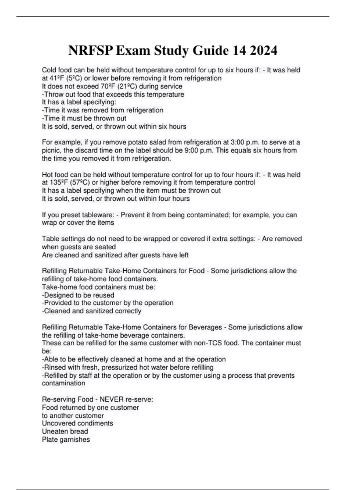 Cold food can be held without temperature control for up to six hours if: - It was held at 41ºF (5ºC) or lower before removing it from refrigeration It does not exceed 70ºF (21ºC) during service -Throw out food that exceeds this temperature It has a label specifying: -Time it was removed from refrigeration -Time it must be thrown out It is sold, served, or thrown out within six hours For example, if you remove potato salad from refrigeration at 3:00 p.m. to serve at a picnic, the discard time on the label should be 9:00 p.m. This equals six hours from the time you removed it from refrigeration. Hot food can be held without temperature control for up to four hours if: - It was held at 135ºF (57ºC) or higher before removing it from temperature control It has a label specifying when the item must be thrown out It is sold, served, or thrown out within four hours If you preset tableware: - Prevent it from being contaminated; for example, you can wrap or cover the items Table settings do not need to be wrapped or covered if extra settings: - Are removed when guests are seated Are cleaned and sanitized after guests have left Refilling Returnable Take-Home Containers for Food - Some jurisdictions allow the refilling of take-home food containers. Take-home food containers must be: -Designed to be reused -Provided to the customer by the operation -Cleaned and sanitized correctly Refilling Returnable Take-Home Containers for Beverages - Some jurisdictions allow the refilling of take-home beverage containers. These can be refilled for the same customer with non-TCS food. The container must be: -Able to be effectively cleaned at home and at the operation -Rinsed with fresh, pressurized hot water before refilling -Refilled by staff at the operation or by the customer using a process that prevents contamination Re-serving Food - NEVER re-serve: Food returned by one customer to another customer Uncovered condiments Uneaten bread Plate garnishes Generally, only unopened, prepackaged food in good condition can be re-served: - Condiment packets Wrapped crackers or breadsticks, and bottles of ketchup and mustard You must protect condiments from contamination. Serve them in their original containers or in containers designed to prevent contamination. Offering condiments in individual packets or portions can also help keep them safe. Never re-serve uncovered condiments. Do not combine leftover condiments with fresh ones. Throw away opened portions or dishes of condiments after serving them to customers. Salsa, butter, mayonnaise, and ketchup are examples. Change linens used in bread baskets after each customer. Labeling Bulk Food in Self-Service Areas - Make sure the label is in plain view of the customer