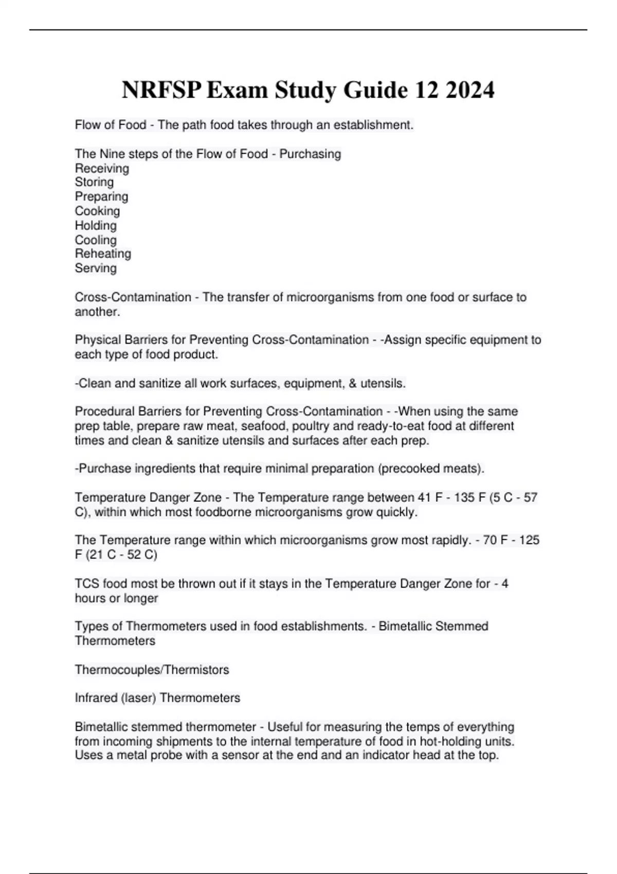 Flow of Food - The path food takes through an establishment. The Nine steps of the Flow of Food - Purchasing Receiving Storing Preparing Cooking Holding Cooling Reheating Serving Cross-Contamination - The transfer of microorganisms from one food or surface to another. Physical Barriers for Preventing Cross-Contamination - -Assign specific equipment to each type of food product. -Clean and sanitize all work surfaces, equipment, & utensils. Procedural Barriers for Preventing Cross-Contamination - -When using the same prep table, prepare raw meat, seafood, poultry and ready-to-eat food at different times and clean & sanitize utensils and surfaces after each prep. -Purchase ingredients that require minimal preparation (precooked meats). Temperature Danger Zone - The Temperature range between 41 F - 135 F (5 C - 57 C), within which most foodborne microorganisms grow quickly. The Temperature range within which microorganisms grow most rapidly. - 70 F - 125 F (21 C - 52 C) TCS food most be thrown out if it stays in the Temperature Danger Zone for - 4 hours or longer Types of Thermometers used in food establishments. - Bimetallic Stemmed Thermometers Thermocouples/Thermistors Infrared (laser) Thermometers Bimetallic stemmed thermometer - Useful for measuring the temps of everything from incoming shipments to the internal temperature of food in hot-holding units. Uses a metal probe with a sensor at the end and an indicator head at the top. Thermocouple and Thermistor - Measure temperatures through a metal probe or sensing area and display results on a digital readout. Basic Types of Thermometer Probes - Immersion Surface Penetration Air temperature